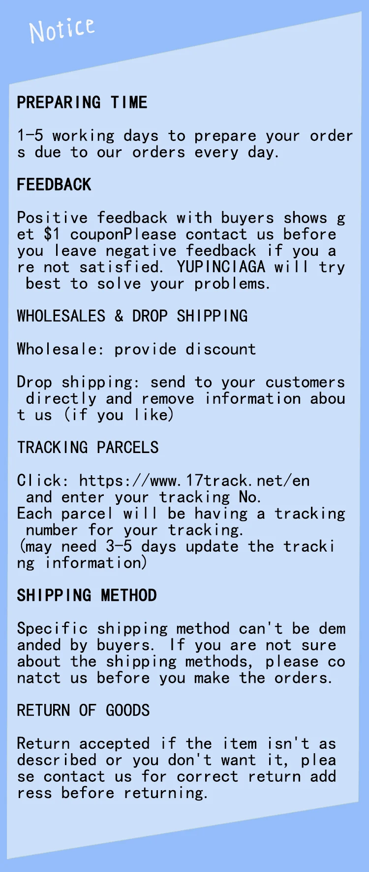 1. Если вы недовольны по какой-либо причине или у вас возникли проблемы с вашим заказом, пожалуйста, дайте нам знать, прежде чем оставлять отзывы. Мы более чем рады вернуть или обменять товар. 2. Мы всегда отправляем посылка в безопасной упаковке. Если вы видите что-то сломанное, когда получаете посылка, пожалуйста, сделайте фотографии прямо сейчас вместо того, чтобы сбросить его! И мы можем начать возврат и обмен сразу же! 3. Мы добрый и честный продавец. Мы надеемся, что каждый покупатель будет наслаждаться вашими покупками здесь. Мы стремимся получить положительные отзывы по всем сделкам. Прежде чем открыть спор, пожалуйста, свяжитесь с нами. 4. Мы будем рады предложить вам наш отличный сервис!