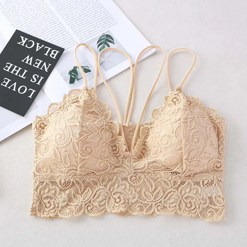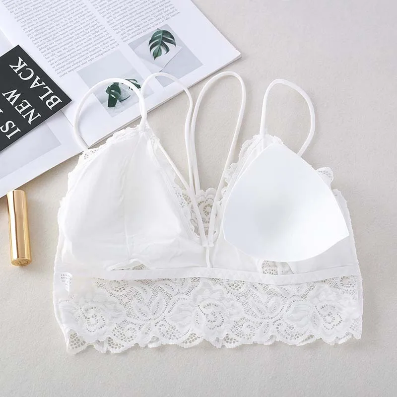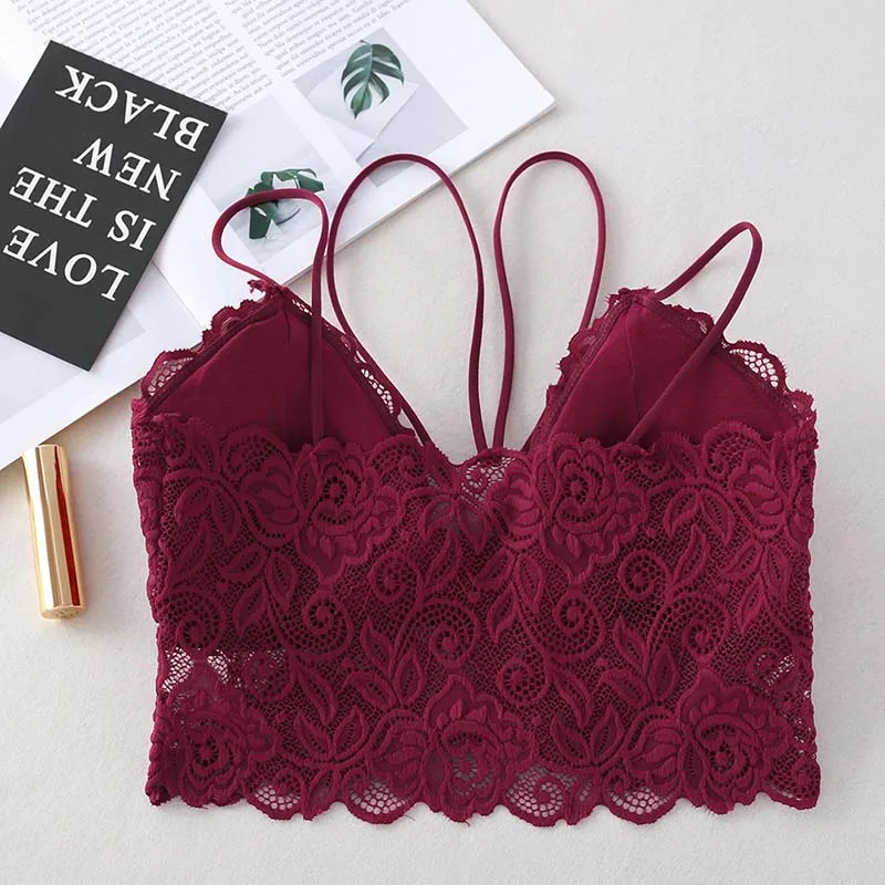 Изготовлено из мягкого стрейчевого вязаного кружева в богатом сплошном виде и имеет треугольные чашки, которые частично обшиты съемными навесами для покрытия и комфорта.