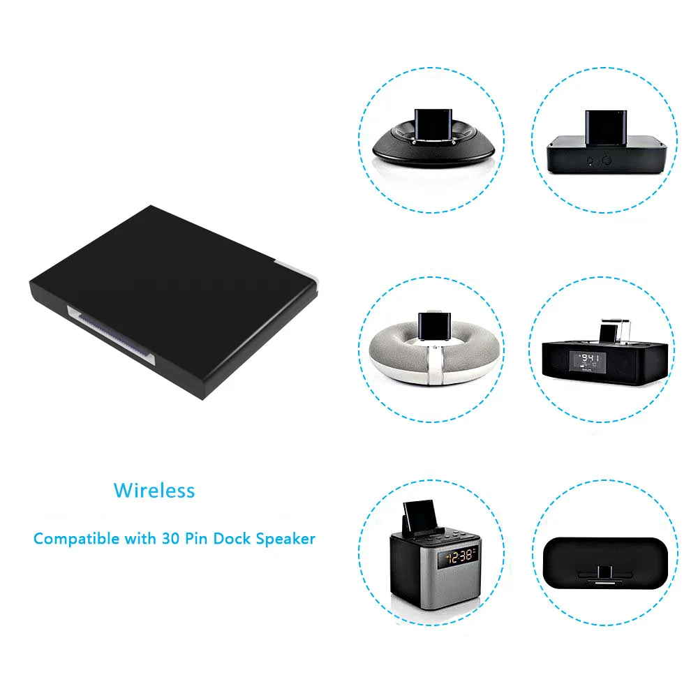 Особенности: 100% новый брендовый товар высокого качества! Новый мини-светильник, портативный дизайн. Простота в использовании, подключая непосредственно к 30 контактной док-станции, чтобы изменить общую звуковую коробку на звуковую коробку. На расстоянии, чтобы воспроизвести ваши любимые песни на вашем устройстве через подключение. Поддержка цифровых продуктов, таких как iPad, iPod, iPhone, сотовый телефон, ПК, PSP. Совместим с 2,0, Plug and Play. Поддержка A2DP V1.2, Совместимость со всеми устройствами, поддерживающими A2DP стерео. Примечание: Мы протестировали для iPhone, iPad, iPod, звуковой эффект лучше, чем у NOKIA. Если вы используете не брендовый, потому что класс вашего телефона или mp3, который является передающей частью, влияет на окончательный эффект звука. Звуковое оборудование, с которым вы подключены, также влияет на конечный эффект звука. Мы протестировали стереосистему 2,1 с басами, эффект басов сильный и идеальный, Но это не так идеально, когда вы подключаетесь к обычному динамику. Расстояние передачи зависит от передающего оборудования. Мы протестировали то же самое с iPhone и NOKIA. В тех случаях, когда используется для iPhone, Дальность передачи может достигать более 10 метров; При использовании, сила сигнала становится слабой, около 8 метров. Это показывает, что класс вашего телефона или mp3 Определение расстояния приема и передачи сигнала. Этот товар не совместим с универсальной док-станцией Apple. Этот товар не совместим с автомобильной стереосистемой Параметры: Технические характеристики: Bluetooth 2,1 + EDR Поддержка V.2.0 A2DP V.1.2 Выход: 30pin аудиовыход Разъем: оборудование с док-станцией Apple 30-Pin Дальность передачи: до 10 метров (33 фута). Размер блока: 42*36*7 мм Цвет: черный, белый Посылка включает в себя: Музыкальный приемник-1 шт.