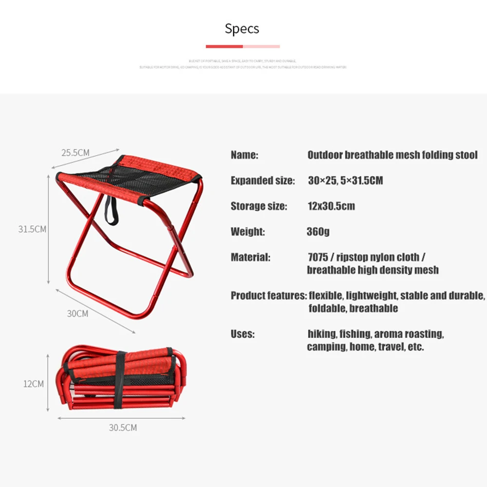 Характеристики: Название: складывающийся стул из дышащей сетки Увеличенный размер: 30 × 25,5 × 31,5 см Коробка для хранения Размер: 12 × 30,5 см Материал: 7075/нейлоновая ткань Рипстоп/дышащая сетка высокой плотности Посылка включает в себя: 1 * складной стул