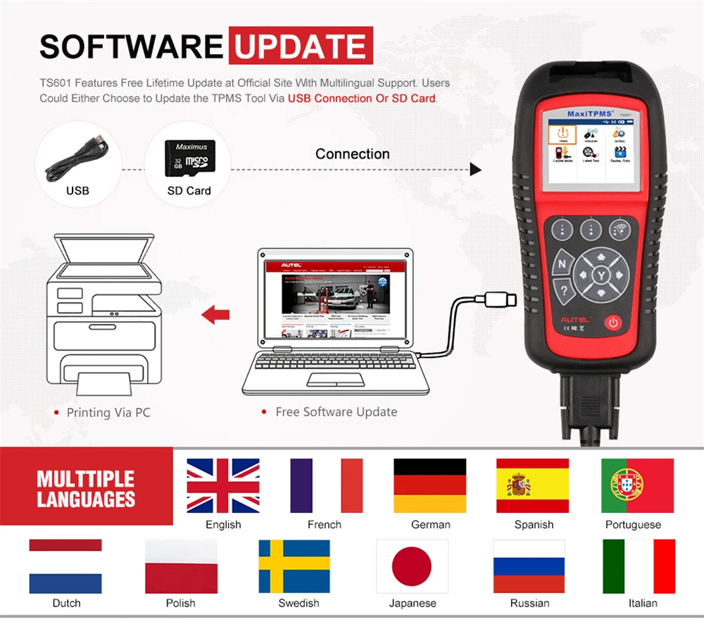 MaxiTPMS®TS601 является самым мощным диагностическим и сервисным инструментом TPMS в мире, способным полностью диагностировать проблемы TPMS, а также активировать датчики TPMS и перепрограммировать ЭБУ автомобиля. Этот профессиональный инструмент-лучшее решение для шинных магазинов и автомобильных мастерских для выполнения услуг TPMS!