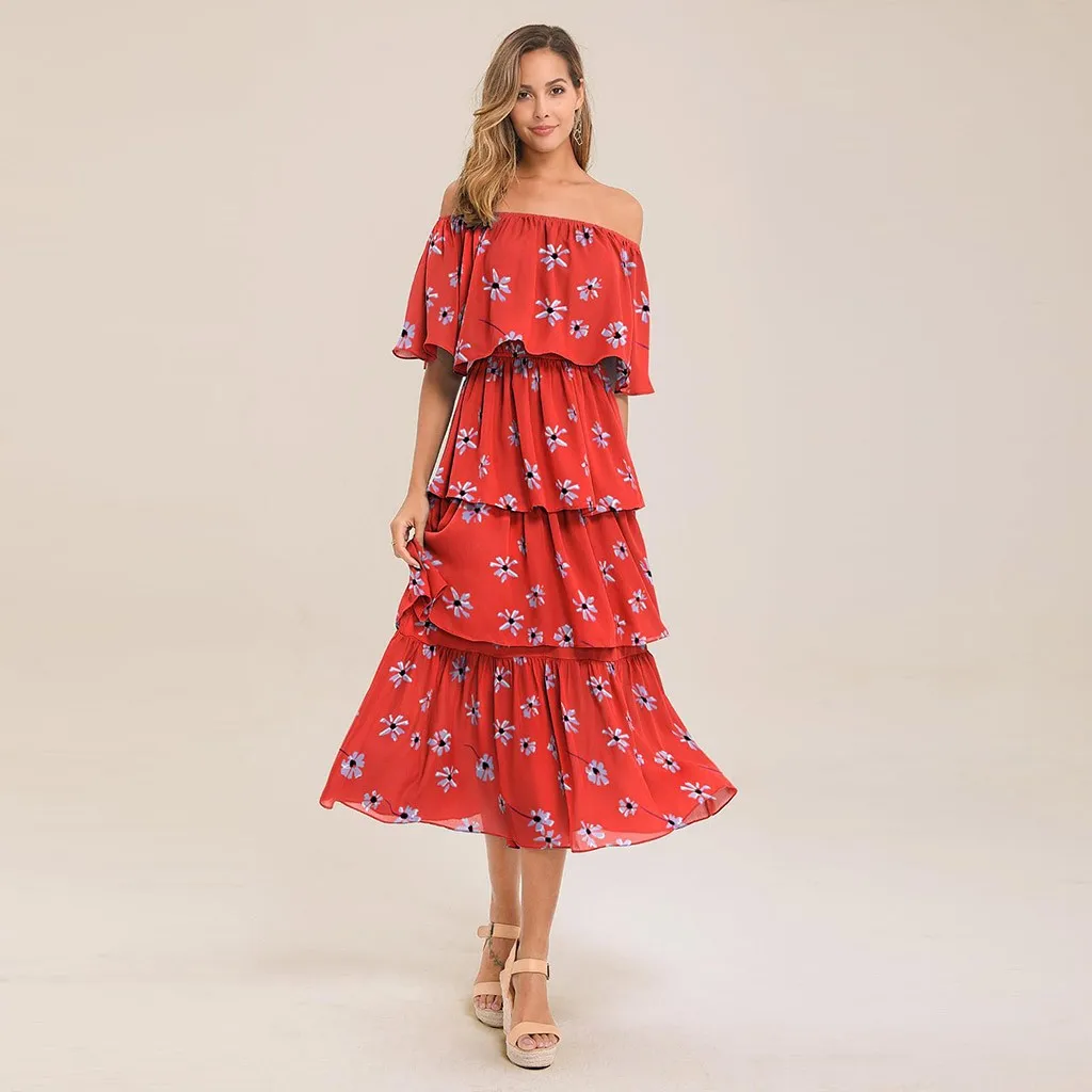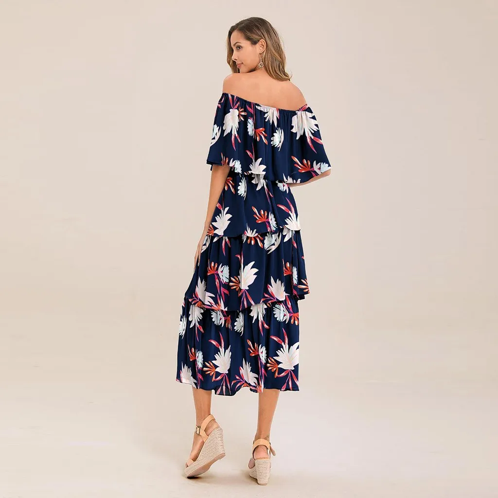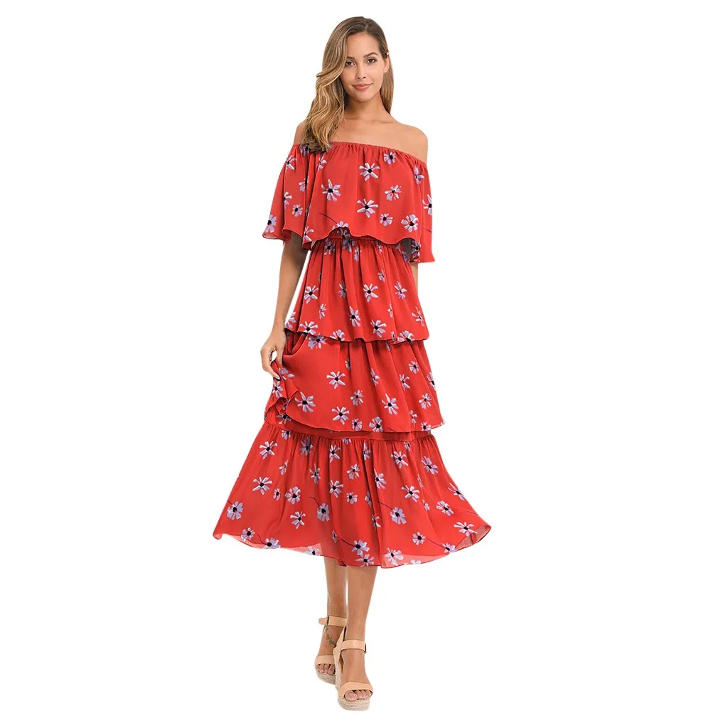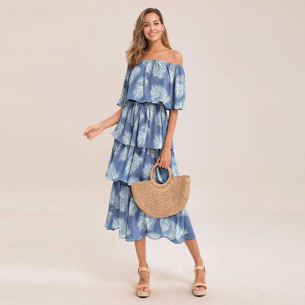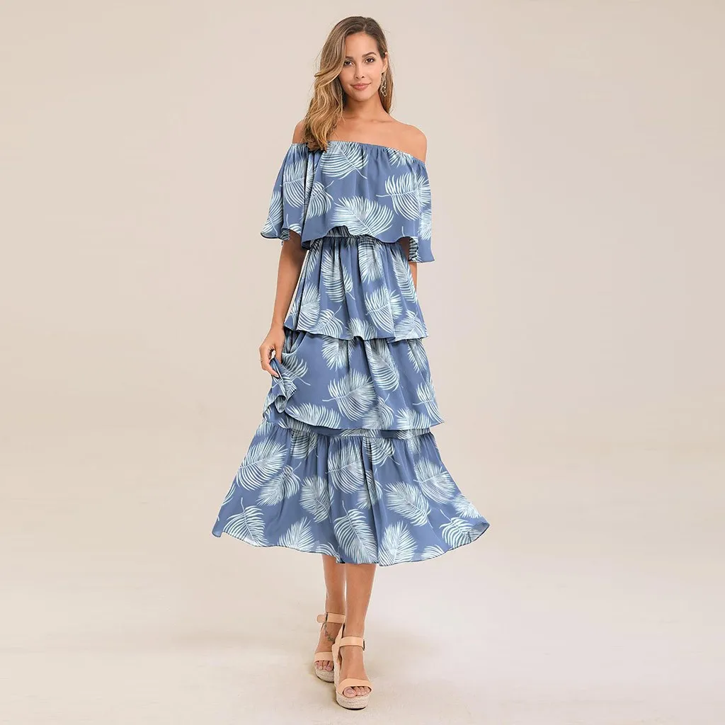 Женское платье с открытыми плечами, коротким рукавом и принтом, нарядное платье, Пляжное длинное платье