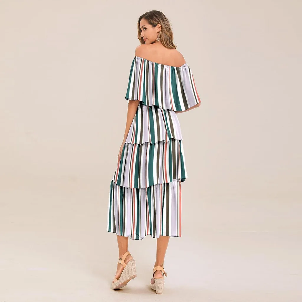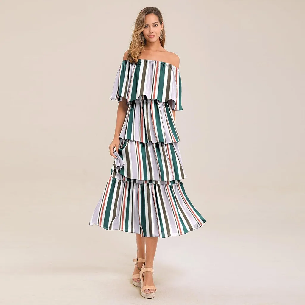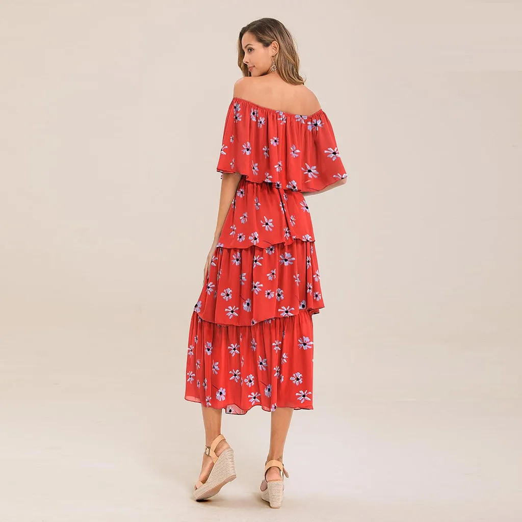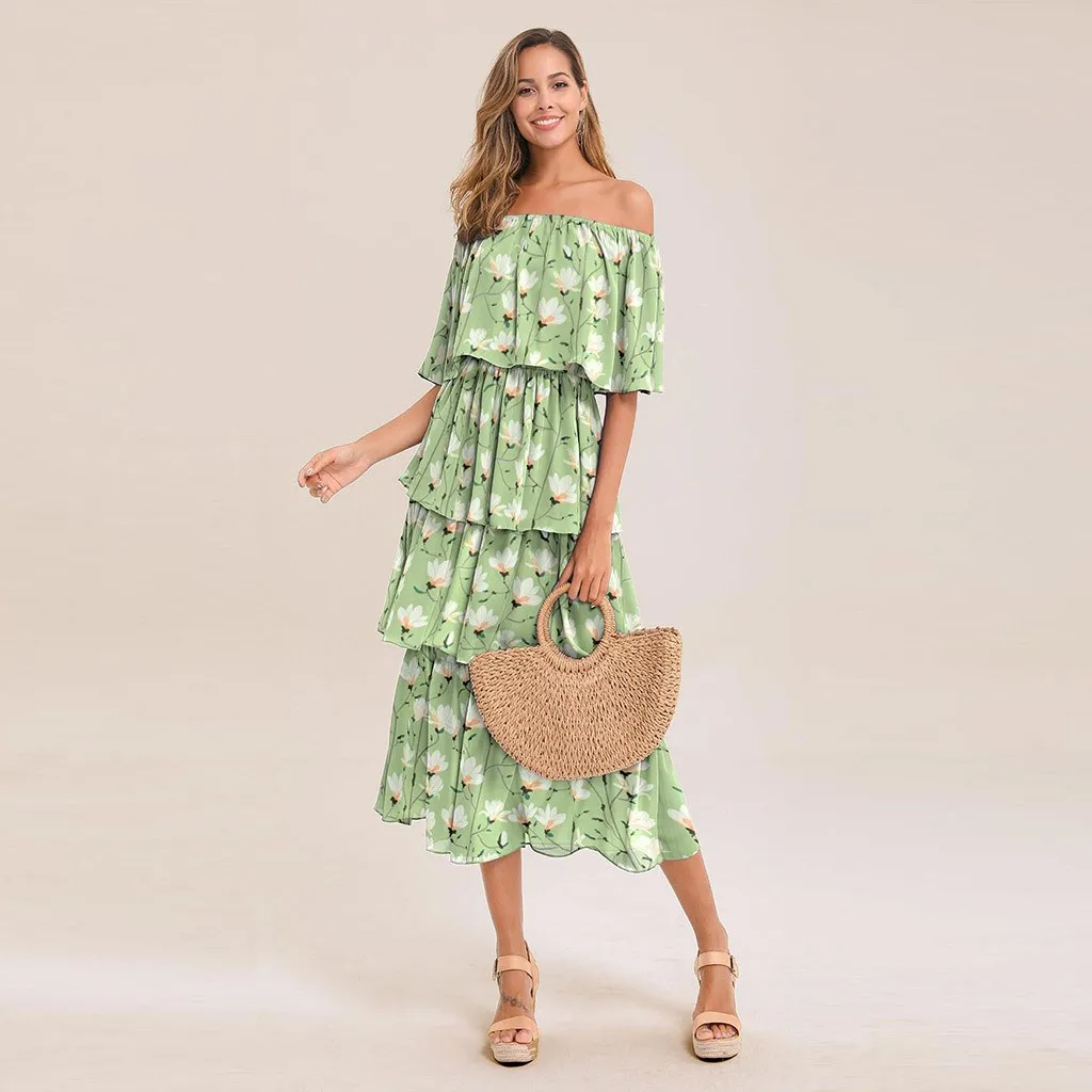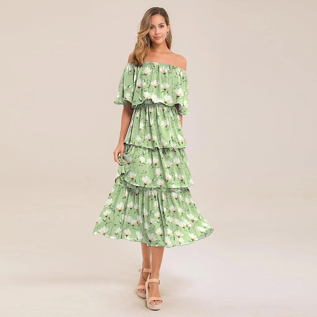 Женское платье с открытыми плечами, коротким рукавом и принтом, нарядное платье, Пляжное длинное платье