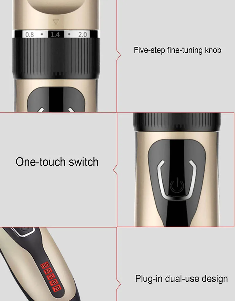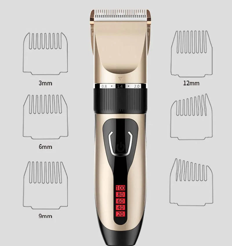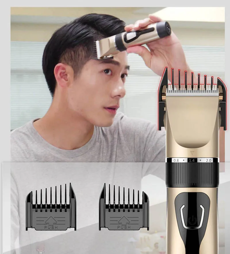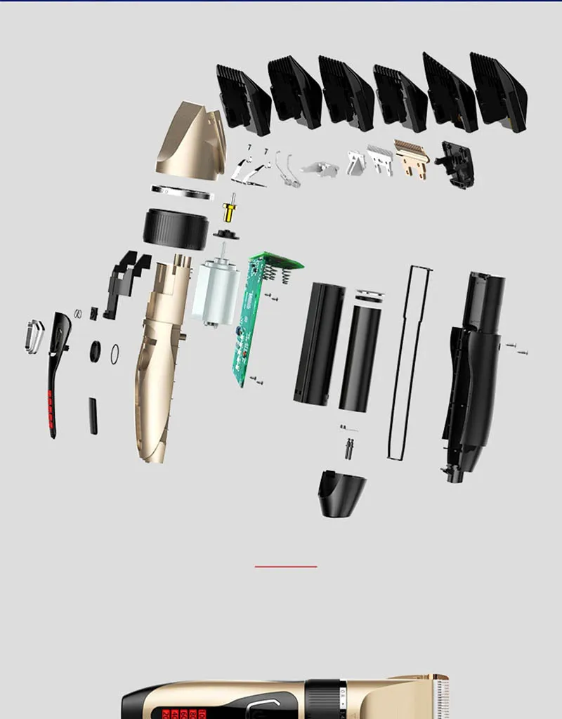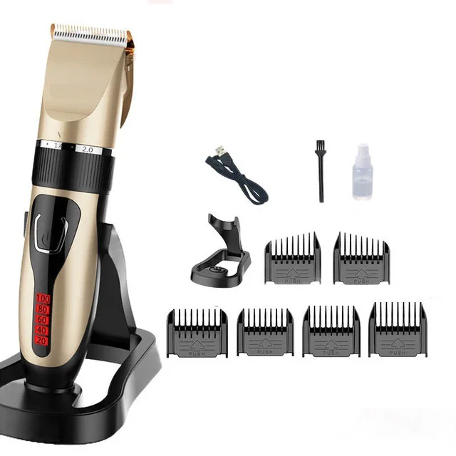Название продукта: профессиональная машинка для стрижки волос Размер изделия: 45 мм X 190 мм Материал головки инструмента: титановая керамическая режущая головка Способ зарядки: зарядка через Usb Время работы в режиме ожидания: около трех часов Мотор продукта: 3,7 В Емкость аккумулятора: 1200ма Цвет изделия: золотой, синий