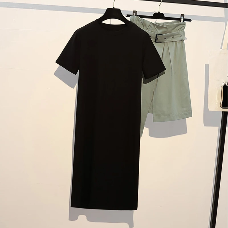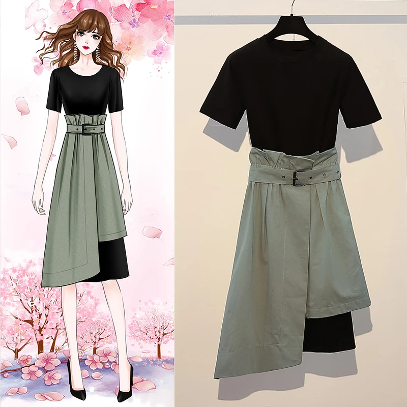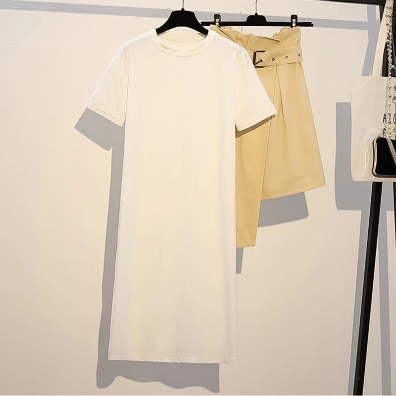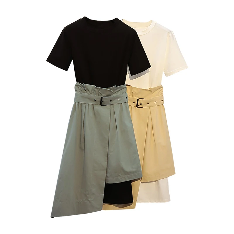 Модные костюмы размера плюс для женщин 2020, летний комплект из двух предметов, платье-рубашка с круглым вырезом и асимметричная юбка с поясом S01706K