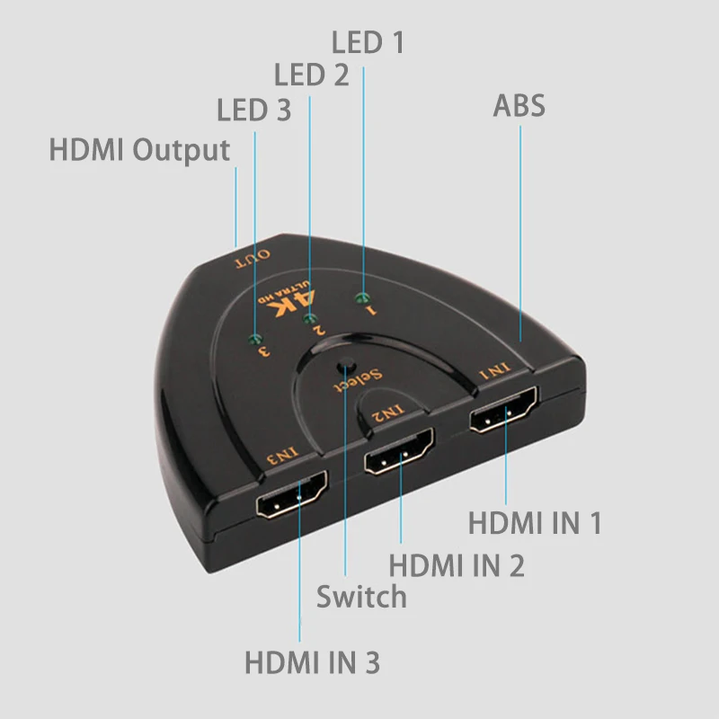 Три hdmi-входа подключения, выходы, интерфейс HDMI, клавишный переключатель свободно с cue огнями (вход и выход HDMI кабель должен подготовить свой собственный);