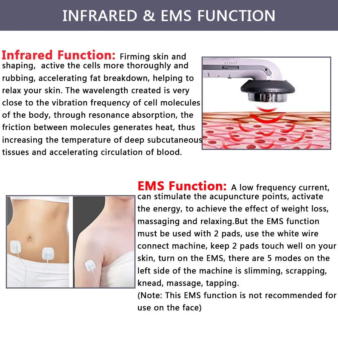 Описание: Категория: инструмент для красоты и похудения Цвет: белый Спецификация вилки: британское правило Материал: АБС-пластик, сплав Эффективность: поглощение жира, потребление жира, здоровая потеря веса Функция: Ультразвуковой вибрационный массаж, светодиодный светильник красного цвета, EMS бионический ток Мощность: 100-240 В Выходная частота: 50-60 Гц Потребляемая мощность: 12 Вт Использование: нет функции питания, необходимо подключить зарядное устройство Размер изделия: 30*15*5 см Особенности: Уход за кожей, чтобы очистить, осветлить, сгладить внешний вид кожи. Глубокое очищение и увлажнение, уменьшает появление морщин и жировых отложений и укрепляет текстуру кожи. Это устройство принимает ультразвук 1 МГц и инфракрасную энергию для массажа и эффективного лечения кожи, а также для выполнения ультразвукового массажа для похудения, чтобы лепить контур тела, устранять лишний жир, тонизировать мышцы, стимулирует здоровую функцию тела через омоложение клеток и восстановление метаболизма тела. Этот инструмент может одновременно выполнять ультразвуковую, инфракрасную и микротоковую терапию кожи и тела. Ультразвуковая терапия: Массажный зонд может создавать ультразвуковую вибрацию со скоростью 1000000 раз в секунду, которая наиболее подходит для ухода за телом и может оказывать воздействие на кожу в основном двумя способами: механическое и тепловое действие (физическое) и химическое действие. Тепловая терапия: ошейник ark вокруг массажного зонда излучает инфракрасный луч в спектре 8-12 нм, может углубиться в кожу и подкожные ткани. Инструкции по использованию: 1. Очистите кожу перед нанесением. 2. Равномерно распределите средство для формирования тела на вашей коже (нанесите изделие отдельно в каждой секции, чтобы предотвратить его высыхание на воздухе и привести к нарушенному поглощающему эффекту). 3. Подключите устройство для похудения и украшения. 4. Включите питание, и красный светильник начнет мигать. 5. Нажмите звуковую кнопку один раз для низкой интенсивности (низкой), два раза для высокой интенсивности (высокой). 6. Используйте низкую интенсивность на вашем лице, высокая интенсивность может быть использована d в других частях тела, таких как руки, ноги. 7. Нанесите средство по уходу за кожей (средство по форме тела) на области, которые вы хотите нанести массаж. 8. Не забудьте сохранить вашу кожу увлажненной (Примечание: гель для ухода за кожей рекомендуется, так как они более проводящие). Технология: EMS + инфракрасный + Ультразвуковой Ультразвуковой волновой массаж может повредить жир и утолить вашу кожу без скидки. Интракрасный луч может более тщательно восстановить эластичность и активность клеток. 5 режимов EMS (постукивание, массаж, разминание, скраппинг, похудение), выбор 5 интенсивности, свободный выбор, чтобы вы чувствовали себя комфортно. Примечание: ультразвуковая волна и Дальний инфракрасный свет вызовут ощущение тепла для вашей кожи, это нормальное явление, пожалуйста, используйте с легкостью. Параметры: 1. Дальний инфракрасный свет имеет следующие функции: Связка углеродного волокна, окружающая зонд, может генерировать Дальний инфракрасный луч с длиной волны 8 -12μm. Он может проникать в глубину кожи, увеличивать силу кожи, активировать клетки и ускорять обмен веществ. 2. Ультразвук имеет три основные функции: Он может измен