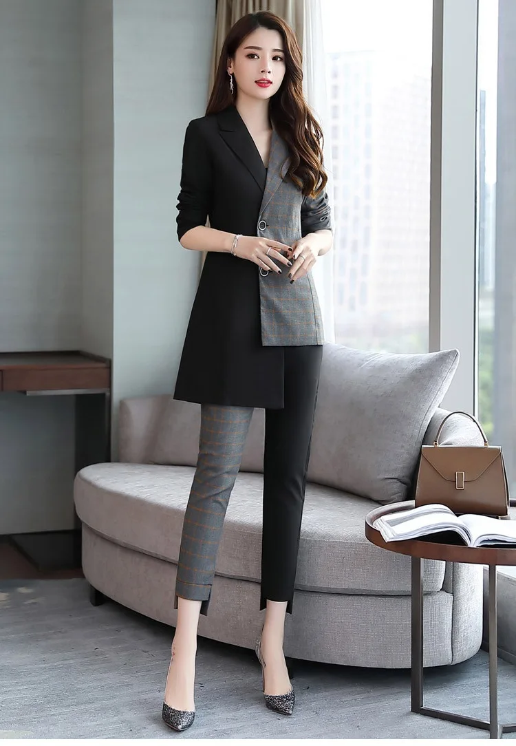 Autumn Irregular 2 Piece Set Women Office Work Top&pants Set Plaid Office Lady Femme 2 Piece Woman Suit Tracksuit DC94<