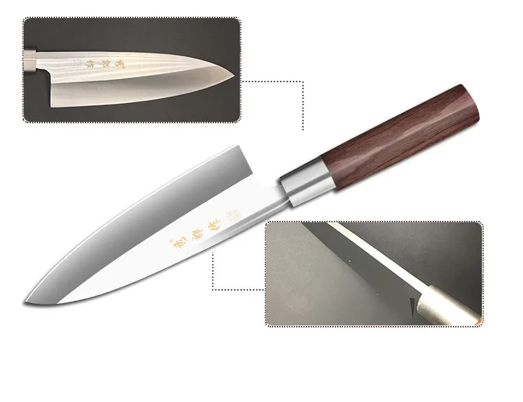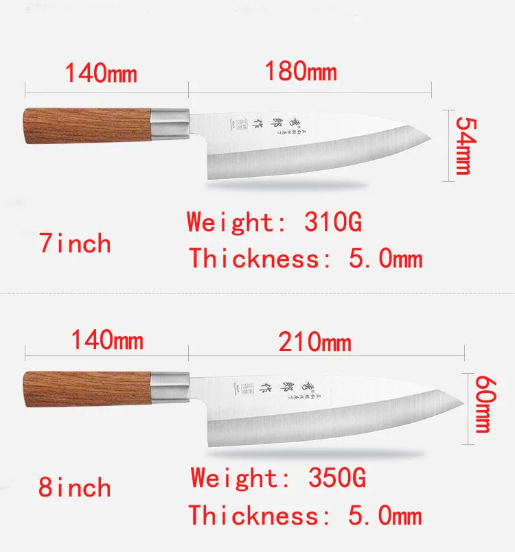 180 мм Тип: многофункциональный японский кухонный нож Материал лезвия: 5Cr15MOV Материал ручки: цвет дерева Длина: 320 мм Длина лезвия: 180 мм Длина ручки: 130 мм Вес нетто: 300 г Твердость: 58 HRC 210 мм Тип: многофункциональный японский кухонный нож Материал лезвия: 5Cr15MOV Материал ручки: цвет дерева Длина: 350 мм Длина лезвия: 210 мм Длина ручки: 130 мм Вес нетто: 360 г Твердость: 58 HRC