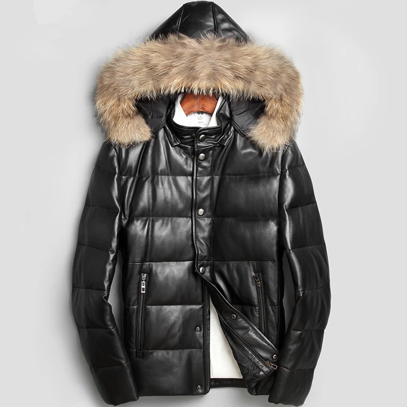 Мужской пуховик из натуральной кожи, зимнее пальто из овечьей кожи, мужская кожаная куртка с воротником из меха енота, мужское пальто на белом утином пуху с капюшоном