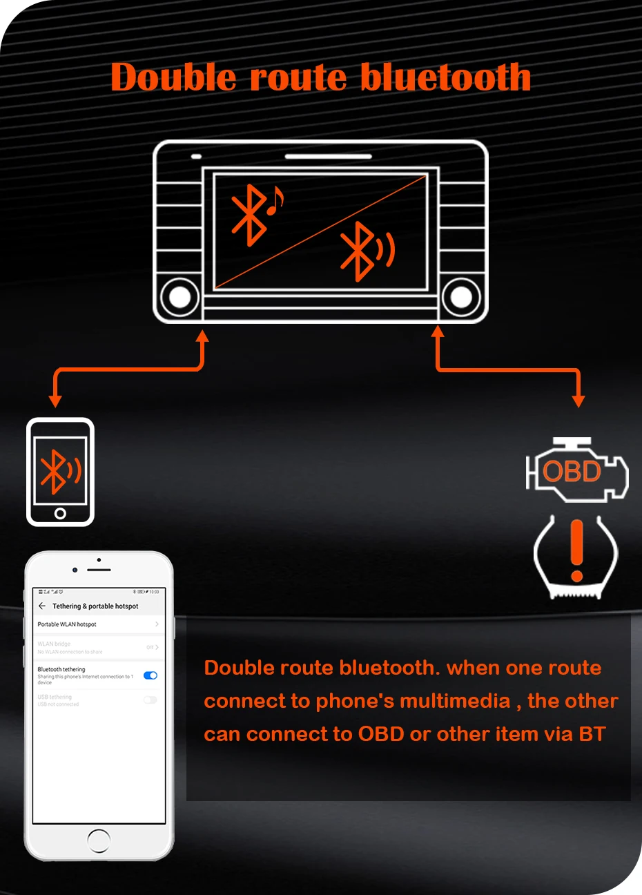 Двухканальный bluetooth, когда один маршрут подключается к мультимедиа телефона, другой может подключаться к OBD или другому товару через Bluetooth.