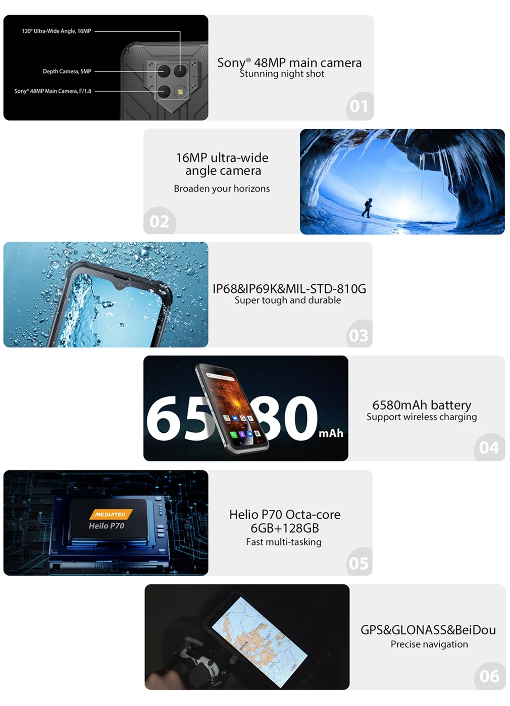 | Особенности:IP68 IP69K MIL-STD-810G/ GPS ГЛОНАСС BEIDOU/Беспроводная зарядка Отпечатков пальцев уход за кожей лица Recoanition/ 16mp ультра-камера с широким углом обзора |