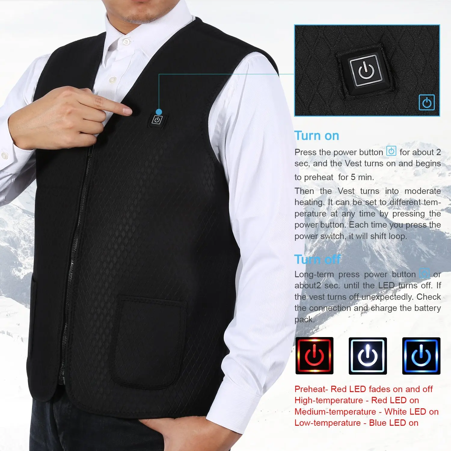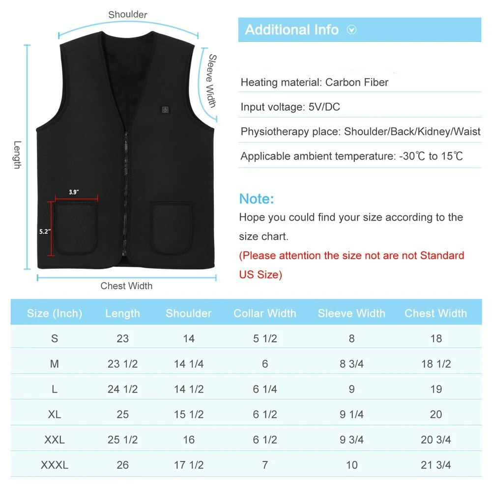 【 Размер 】этот жилет с подогревом имеет 5 размеров s, Пожалуйста, измерьте обхват груди и талии и выберите размер в соответствии с нашей таблицей размеров; Если у вас есть какие-либо сомнения относительно размера, пожалуйста, не стесняйтесь связаться с нами, чтобы помочь вам 【Нагревательный коврик позволяет вам подключаться и играть, встроенный 5 нагревательных элементов из углеродного волокна генерируют тепло через живот, талию и верхнюю часть спины (два на животе, два на талии и один на верхней части спины), чтобы вы чувствовали себя в тепле на 360 градусов и лучше усиливали кровообращение, чтобы облегчить мышцы и дискомфорт в спине 【 3 уровня настройки нагрева и 1 кнопочный контроллер. Простота в эксплуатации, долгое нажатие кнопки led для 2s, чтобы включить/выключить, короткое нажатие кнопки, чтобы переключить режим нагрева; красный-самая высокая температура (50 ℃/122 ℉ до 60 ℃/140 ℉), белый-средняя температура (45 ℃/113 ℉ до 55 ℃/131 ℉), синий-низкая температура (40 ℃/104 ℉ до 50 ℃/122 ℃) 【Безопасный в использовании 】 поставляется с usb-шнуром 5 В, этот жилет с подогревом работает только при подключении, без опции аккумулятора; 5 В/2A банк питания рекомендуется (не входит в комплект); встроенный модуль тепловой защиты, после перегрева, он остановится до тех пор, пока тепло не вернется к стандартной температуре, поэтому он на 100% безопасен в использовании; Следующие данные получены из лабораторного теста: если с 10000 мАч 5 в 2 А, он прослужит 2 ч-3 ч в самом высоком режиме, 4 ч-6 ч в среднем режиме, 6h-8h в самом низком режиме [Washable】 мы предлагаем стирать нагревательный жилет вручную холодной водой, это не повлияет на систему отопления Внутри жилета, безопасный и прочный; Если вы хотите помыть его машиной, пожалуйста, положите теплый жилет в сумку для стирки, чтобы предотвратить ношение или скручивание интерфейса USB