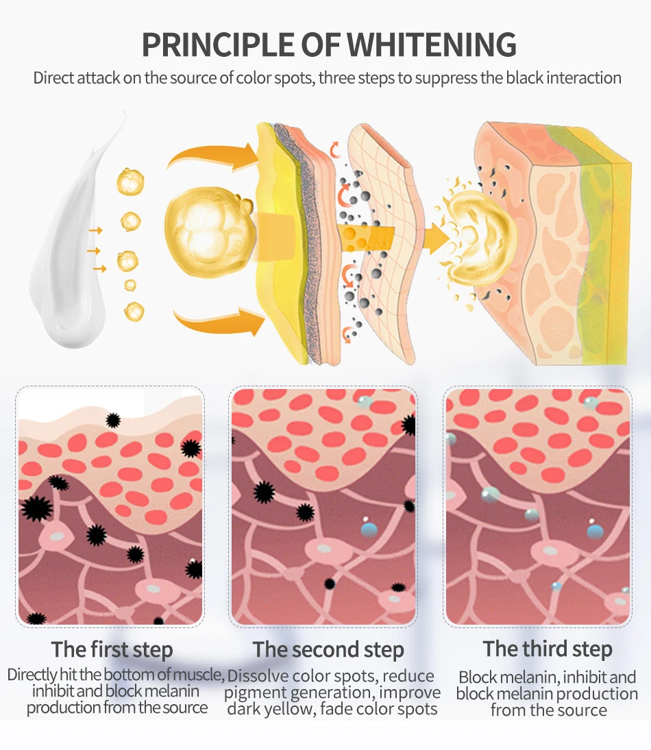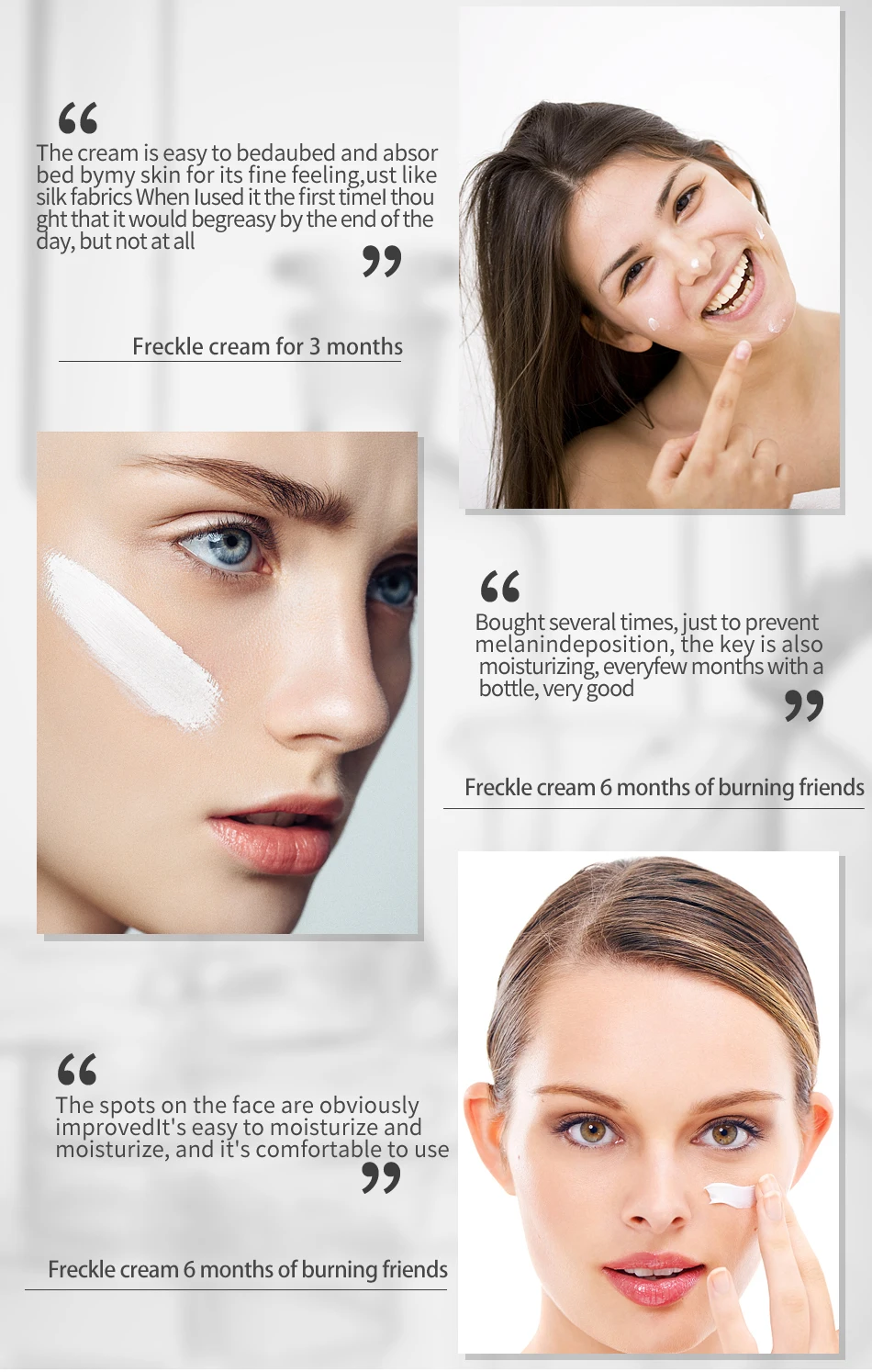 Эффективность:Этот продукт имеет Веснушку, удаление морщин, для устранения меласмы, веснушек, возрастных пятен и других пятен, есть специальные эффекты, молодые люди сталкиваются с акне (акне) также имели значительный эффект. Поддерживать высококачественные Генные косметические технологии, эксклюзивное использование сывороточных белков, биохимических алдол кислот и других биологических формул, а также более устойчивое высвобождение микрокапсул нано-технологии для защиты активных генов, улучшенный традиционный крем для ухода за кожей матричный ген активность не может быть эффективным фактором выживания более быстрый отбеливающий эффект, без каких-либо побочных эффектов