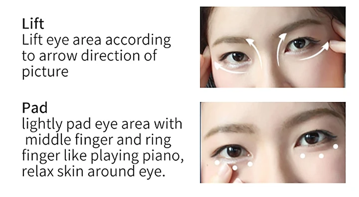 lightly pad eye area with middle finger and ring finger like playing piano, relax skin around eye.