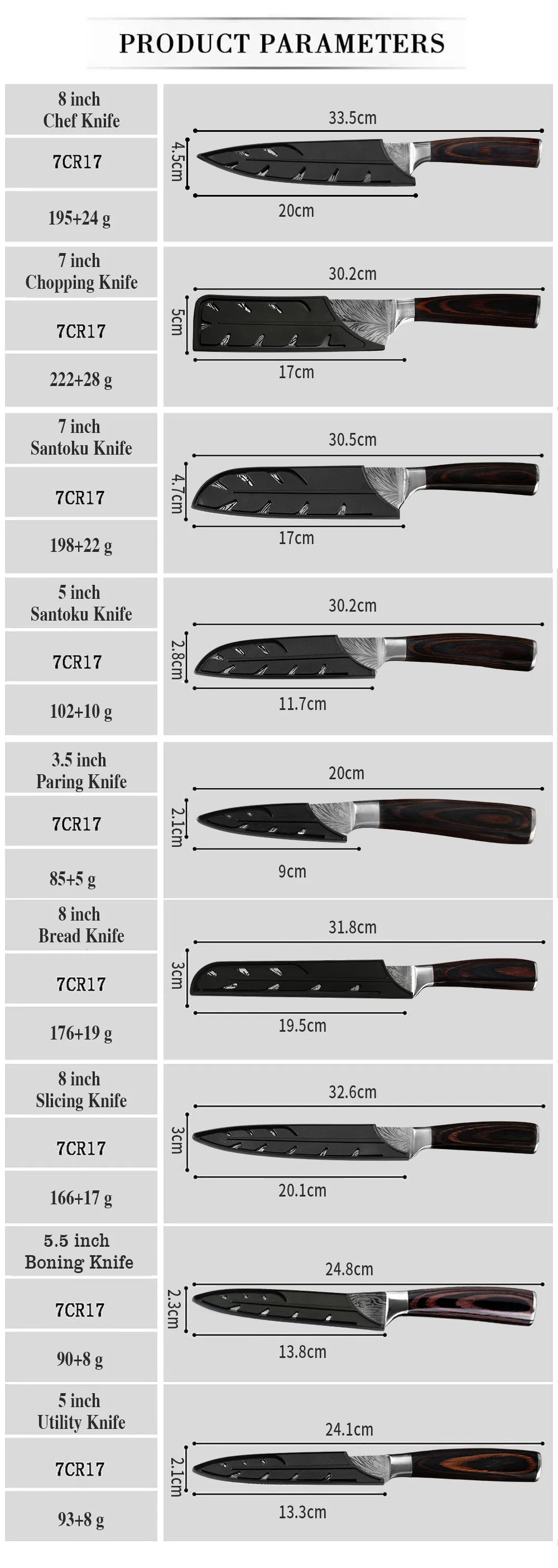 Защита ножей изготовлена из сверхпрочного АБС-пластика, который не токсичен, безопасен для пищевых продуктов и не содержит бисфенола. Эти крышки лезвия обеспечивают дополнительное сцепление для защиты от скольжения и случайного повреждения при перемещении ножей внутри и снаружи оболочки.