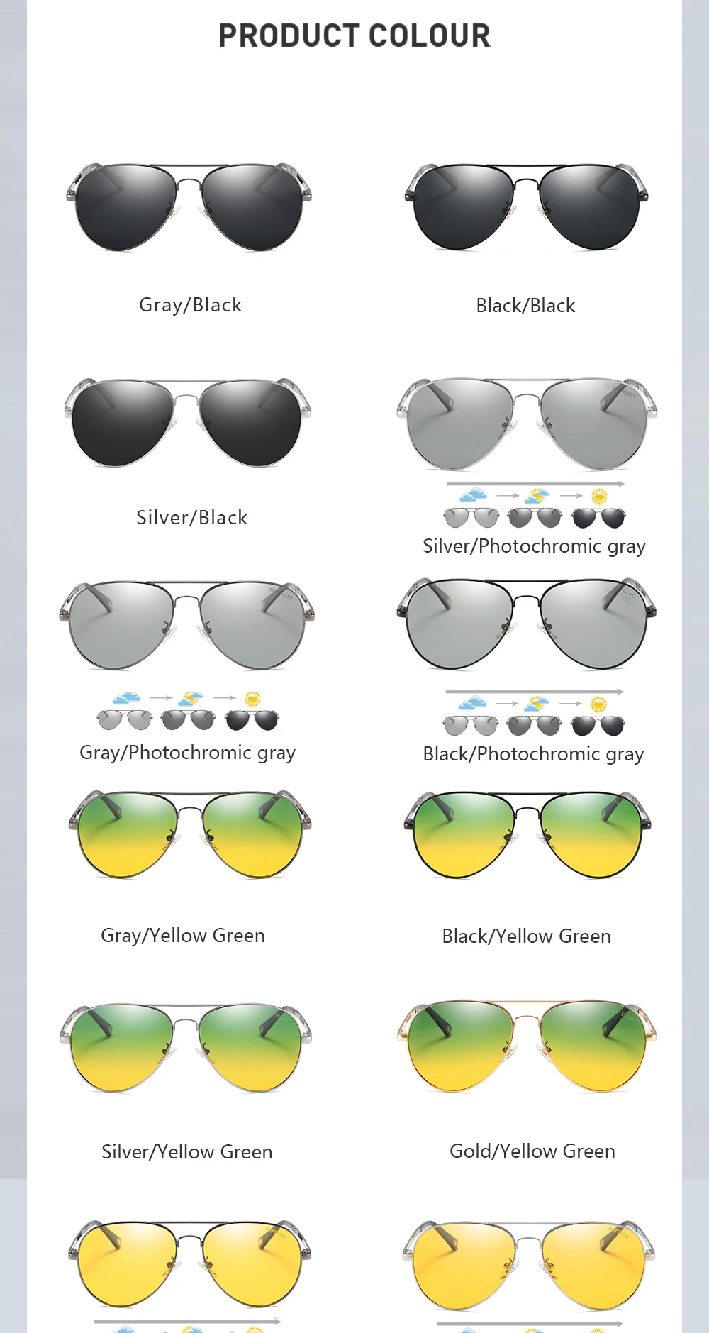 Только серый фотохрический серый цвет, Серебряный фотохромный серый цвет, черный фотохромный серый цвет, черный желтый цвет, серый желтый цвет и серебристо-желтый цвет-фотохромные линзы, другие цветные линзы не фотохромные, обратите внимание. Если вы не уверены, вы можете связаться с нашим клиентом, они могут рекомендовать вам.