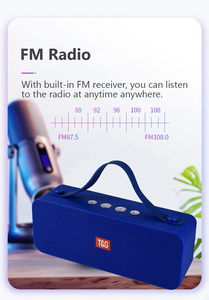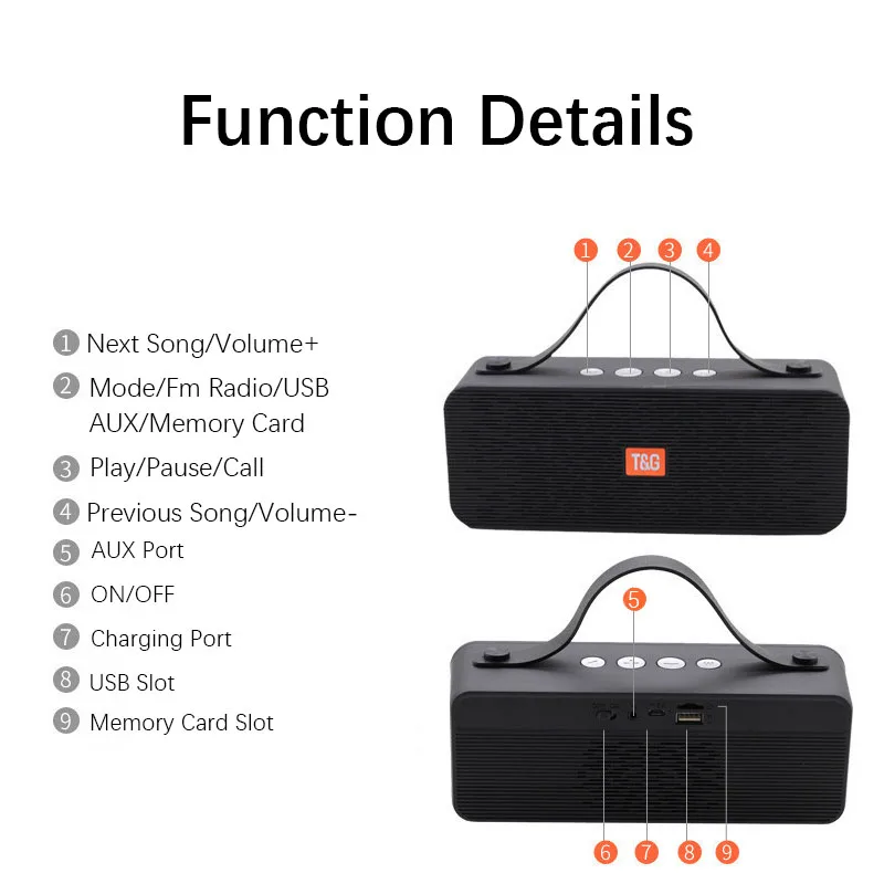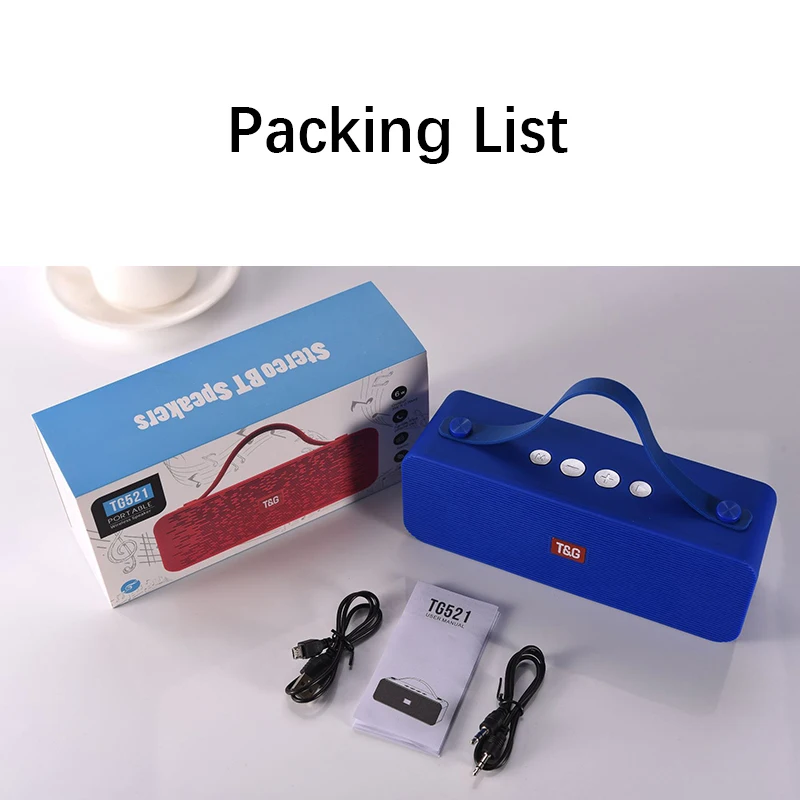 Версия Bluetooth: V5.0 Вес: около 433 г Мощность динамика: 10 Вт PMPO: 20 Вт Встроенный Напряжение: 3,7 V Частотный отклик: 150 Гц-20 кГц Режим воспроизведения: Bluetooth, AUX, tf-карты Размер: 204*60*85 мм Отношение сигнал/шум: ≥ 90 дБ Емкость аккумулятора: 1200 мАч Напряжение зарядки: 5 В/500 мА Время работы: 6-8 ч Бренд: TG