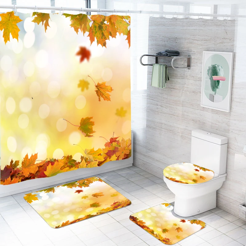 Золотой осенний тематический набор для ванной из 4 частей, Опаленные листья, водонепроницаемый экран с крючками, нескользящий ковер, покрытие для унитаза, коврик для ванной