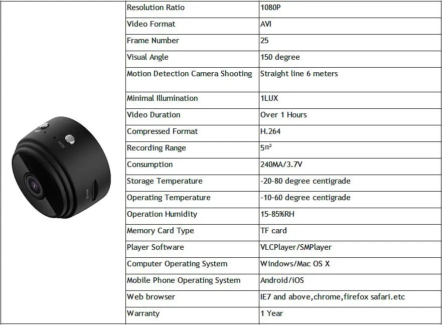 Параметры мини-камеры 1080P:
