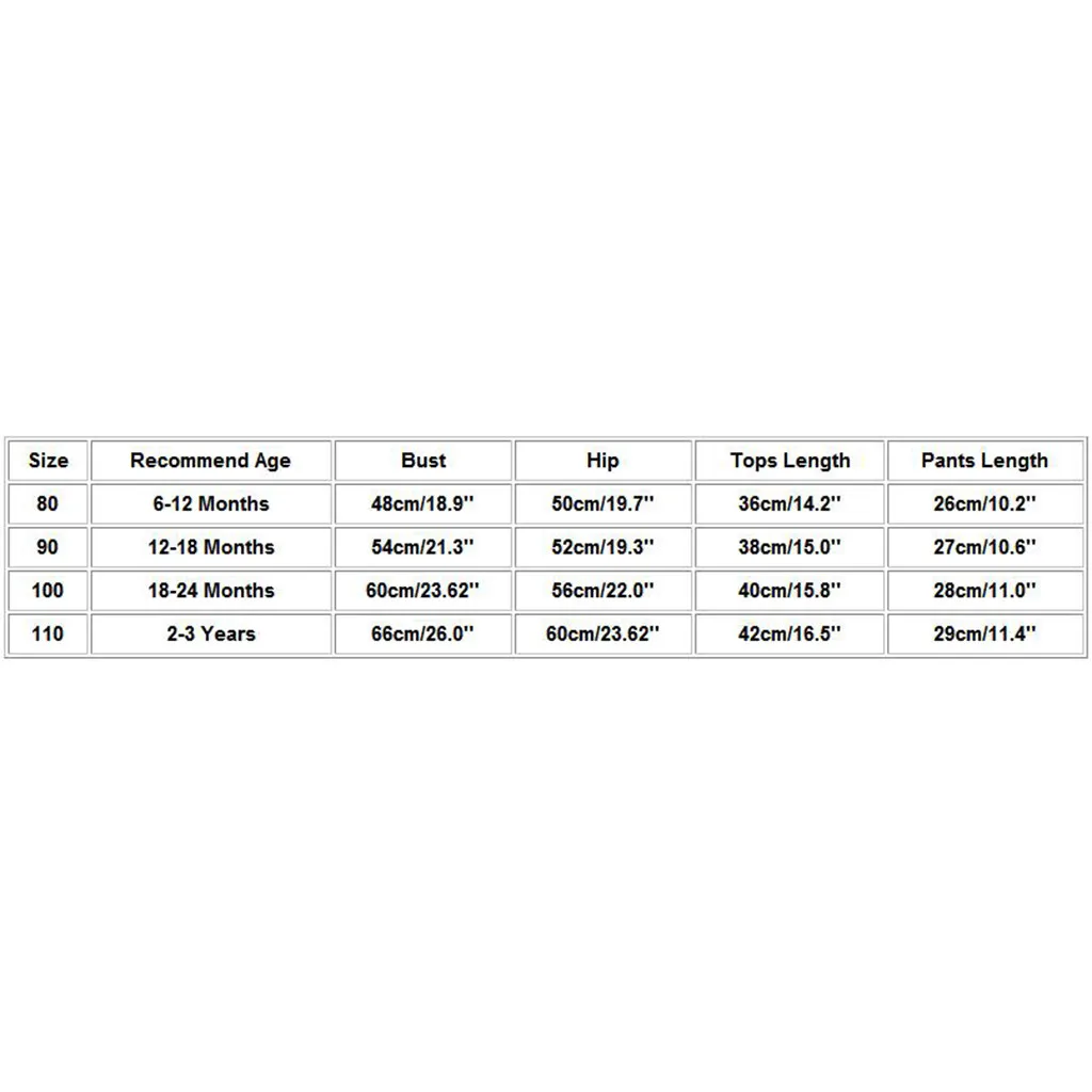 | Размер: 100 | Рекомендуемый возраст: 18-24 месяцев | Обхват груди: 60 см/23,62 дюйма | Обхват бедер: 56 см/22,0 дюйма | Длина топа: 40 см/15,8 дюйма | Длина брюк: 28 см/11,0 дюйма |