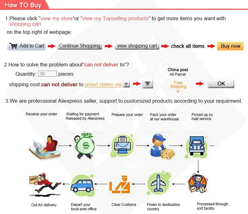 О доставке: Товары будут отправлены в течение 3-7 рабочих дней после подтверждения оплаты. Расчетное время доставки: (важно, пожалуйста, внимательно прочтите перед подачей заявки) 1. США: доставка ePacket из Китая (от 10 до 23 рабочих дней). В России: ePacket Доставка из Китая (от 10 до 30 рабочих дней) 2. По всему миру: Почта Китая заказной авиапочтой. Обычно товар приходит в течение 30-60 рабочих дней после отправки. Для Бразилии требуется больше времени, 50- 120 дней после доставки (приблизительное время доставки, но не гарантировано) во время праздников Сезон, возможны дополнительные задержки. Также некоторые страны могут выбрать AliExpress стандартную доставку.