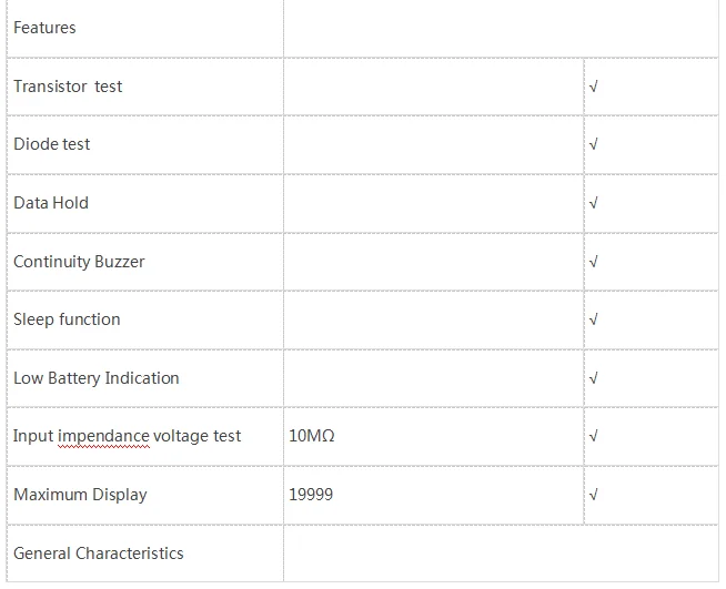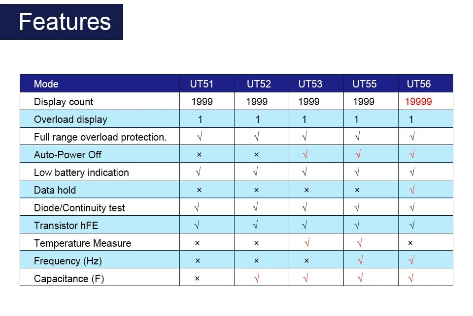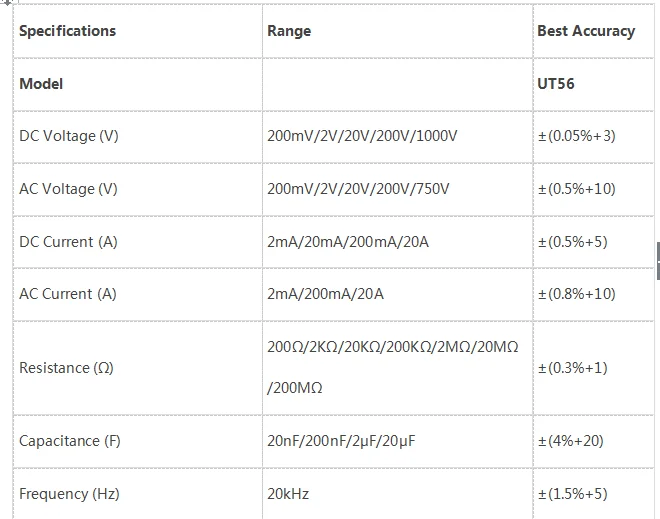 Один из видов UNI-T новой серии UT50 мультиметров-это цифра 3 1/2 с устойчивой функцией и высоконадежным ручным измерительным прибором. счетчик использует большие весы интегральной схемы с двойным интегрированным A/D преобразователем в качестве ядра и имеет полную защиту от перегрузки. измеритель может измерять ток постоянного тока, ток переменного тока, напряжение постоянного тока, напряжение переменного тока, Сопротивление, емкость, диод, температура, частота и непрерывность, что является идеальным инструментом для пользователей. 1. Регулируемая поддержка счетчика, вы можете настроить угол, который вам нужен для измерения в любое время 2. Двойная защита изоляции защищает инструмент, защищая пользователя 3. Большой экран дисплея, написание ясно, слово высокое 27 мм, простое чтение, простота в эксплуатации 4. Компактный корпус, Обтекаемый корпус, эргономичный, удобный в использовании