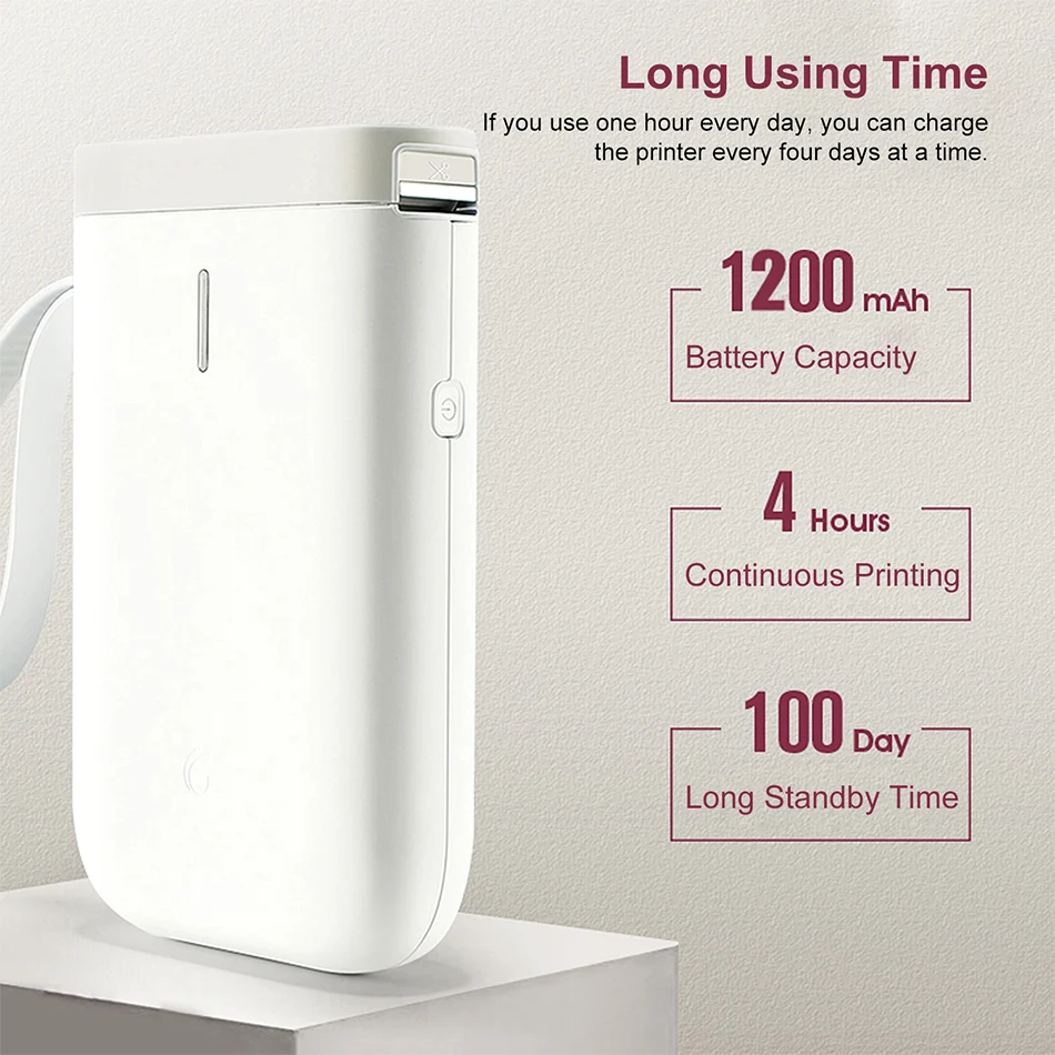 Беспроводной дизайн, поддерживает печать на большие расстояния. Беспроводное расстояние до 10 м. Прямой тепловой, без чернил, тонера или лент. Поддерживает все основные форматы этикеток: цена, дата, размер, вес, имя и т. д. Универсальный, простой в использовании. Компактный и легкий, удобный для переноски. Аккумулятор емкостью 1200 мАч поддерживает длительное использование.