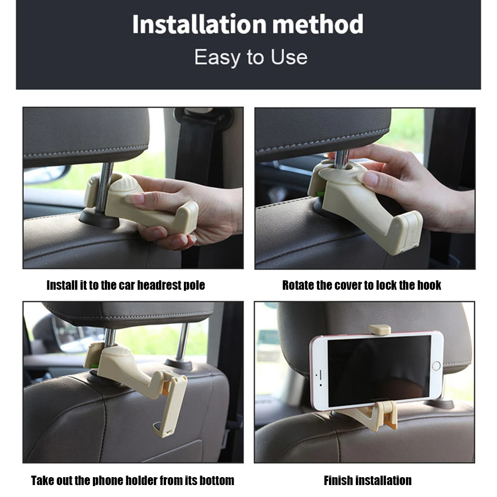 Многофункциональный 2 в 1 Автомобильный крючок на заднем сиденье и держатель для мобильного телефона. Это не только держатель для телефона, но и крючок для подголовника автомобиля. Он может превратить подголовник вашего автомобиля в удобное место для хранения, чтобы повесить продукты, сумочки, сумки, бутылки с водой, детские игрушки, Товары для малышей и многое другое. Он также может работать в качестве держателя мобильного телефона для поддержки вашего телефона, так что вы можете смотреть видео, не держа телефон в руках, очень удобно и практично. Простота установки и использования. Универсальная автомобильная вешалка на спинку сиденья обеспечит вам наиболее удобный опыт вождения.