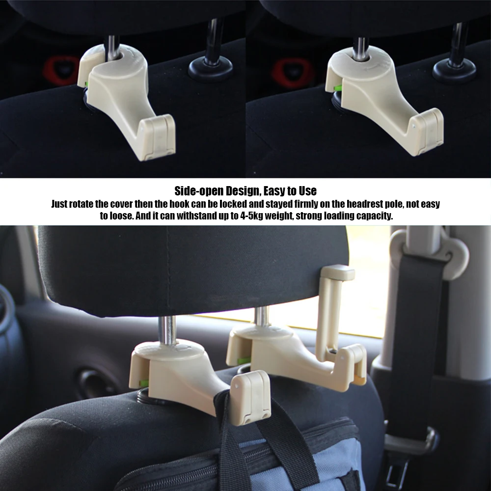 Особенности:Экономия пространства:Крючок можно установить на подголовник автомобиля, чтобы помочь подвесить сумочки, зонты, бутылки с водой, детские игрушки и так далее, экономя место для сидения.Боковая открытая конструкция:Дизайн бокового отверстия для легкой и быстрой установки, нет необходимости разбирать подголовник, никаких инструментов и клея не требуется.Гибкое вращение:Крючок может легко качаться, и его можно спрятать под подголовником, когда вы его не используете.Высокая грузоподъемность:Каждый крючок может держать вес до 4-5 кг, нет риска растрескивания, и они будут держать вещи висят на крючке безопасно.Складной держатель для телефона:Освободите руки, смотрите фильм свободно в путешествии. Регулируемый размер зажима, подходит для большинства мобильных телефонов, и он может надежно удерживать ваш сотовый телефон.Премиум Материал:Изготовлен из АБС-пластика и силиконового материала, экологически чистый и длительный срок службы.Нескользящая конструкция:Силиконовая часть надежно удерживает крючок на подголовнике, не легко упасть и не царапается на подголовник.