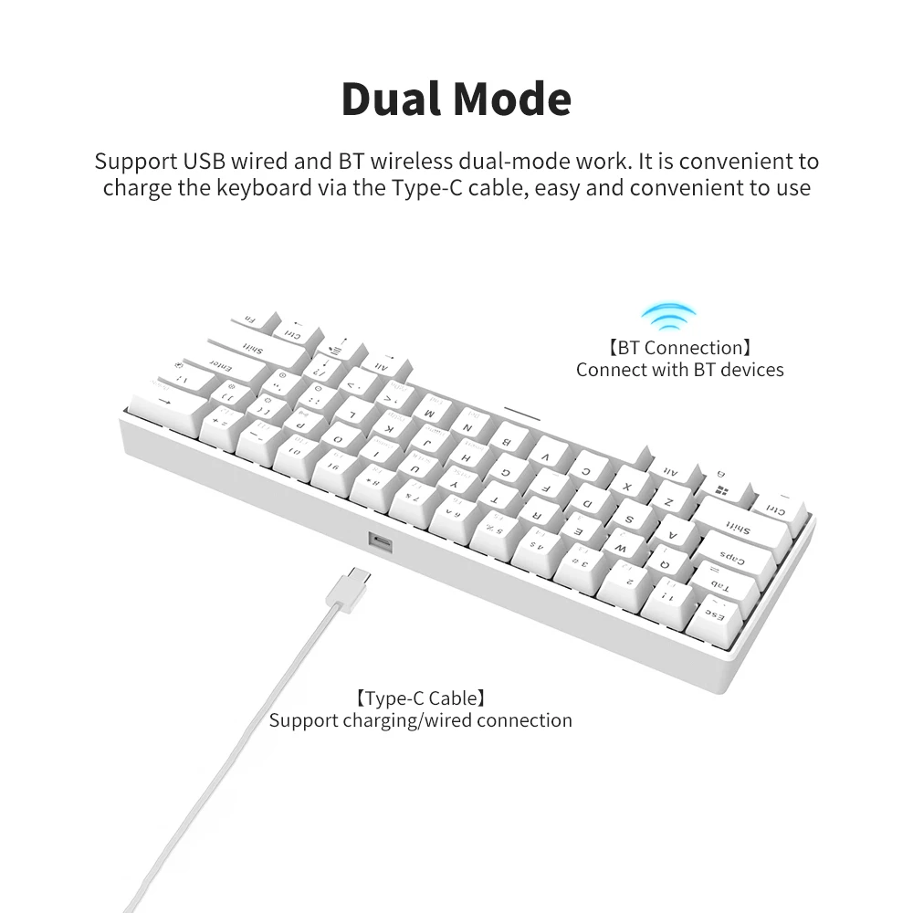 Поддержка проводной и беспроводной работы с двойным режимом. Поддержка BT3.0, может подключаться к устройствам с функцией BT. Встроенный литиевый аккумулятор экономит проблемы с аутсорсинговыми батареями, и его удобно заряжать клавиатуру с помощью кабеля Type-C, легко и удобно использовать.