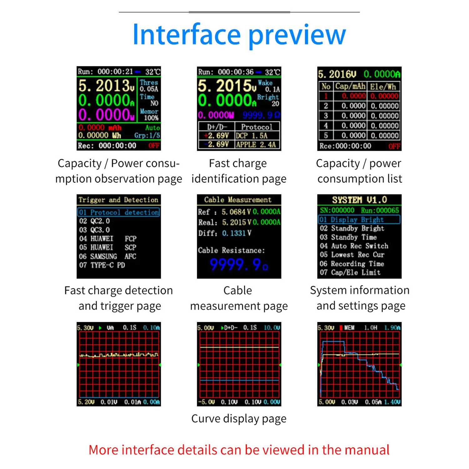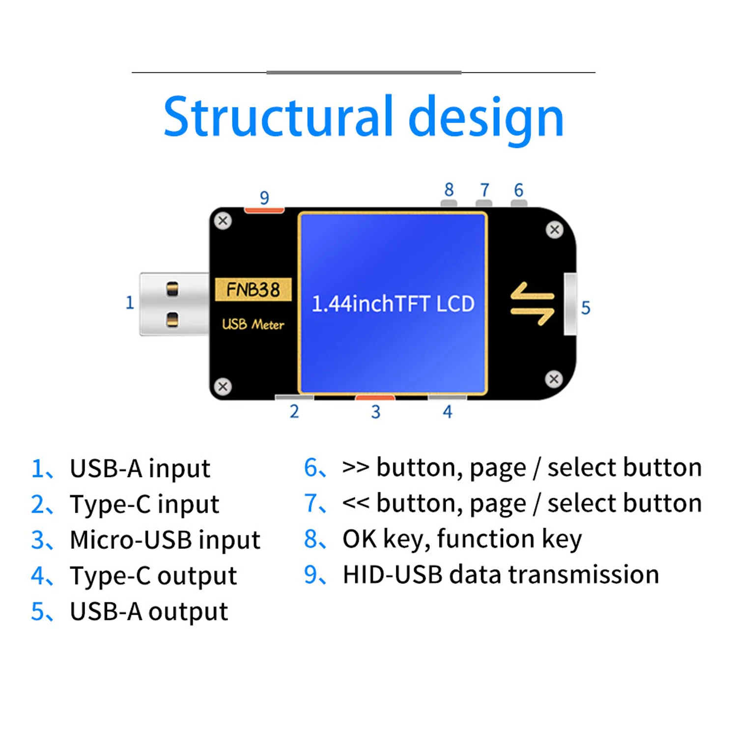 USB2.0 интерфейс, 1,44 дюймов TFT ЖК-дисплей высокой четкости дисплей со встроенным модулем USB-A, с эффектом приближения C зарядкой Micro-USB, Тип-C интерфейсы, yлицы 16-битный АЦП, протокол PD физический чип.