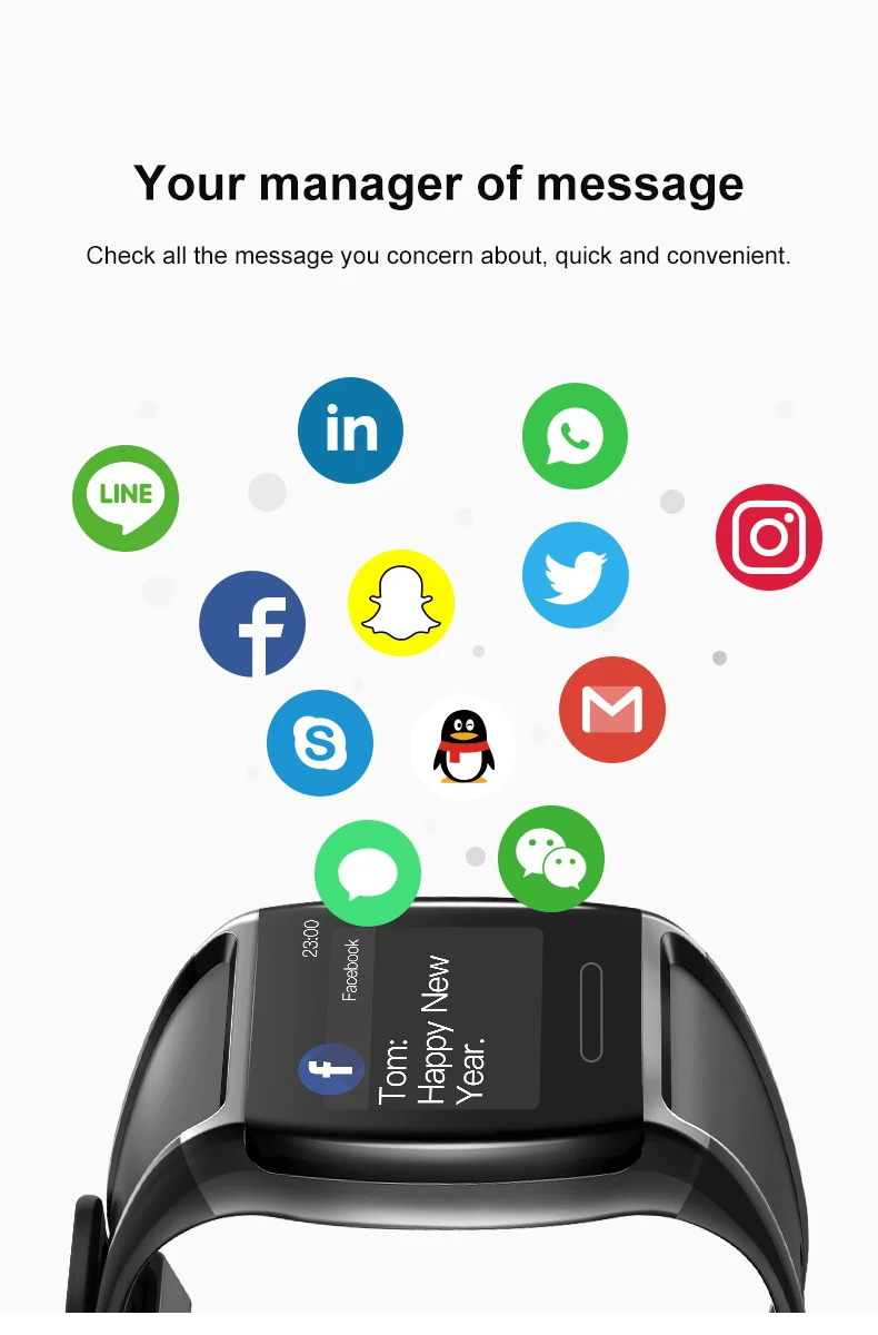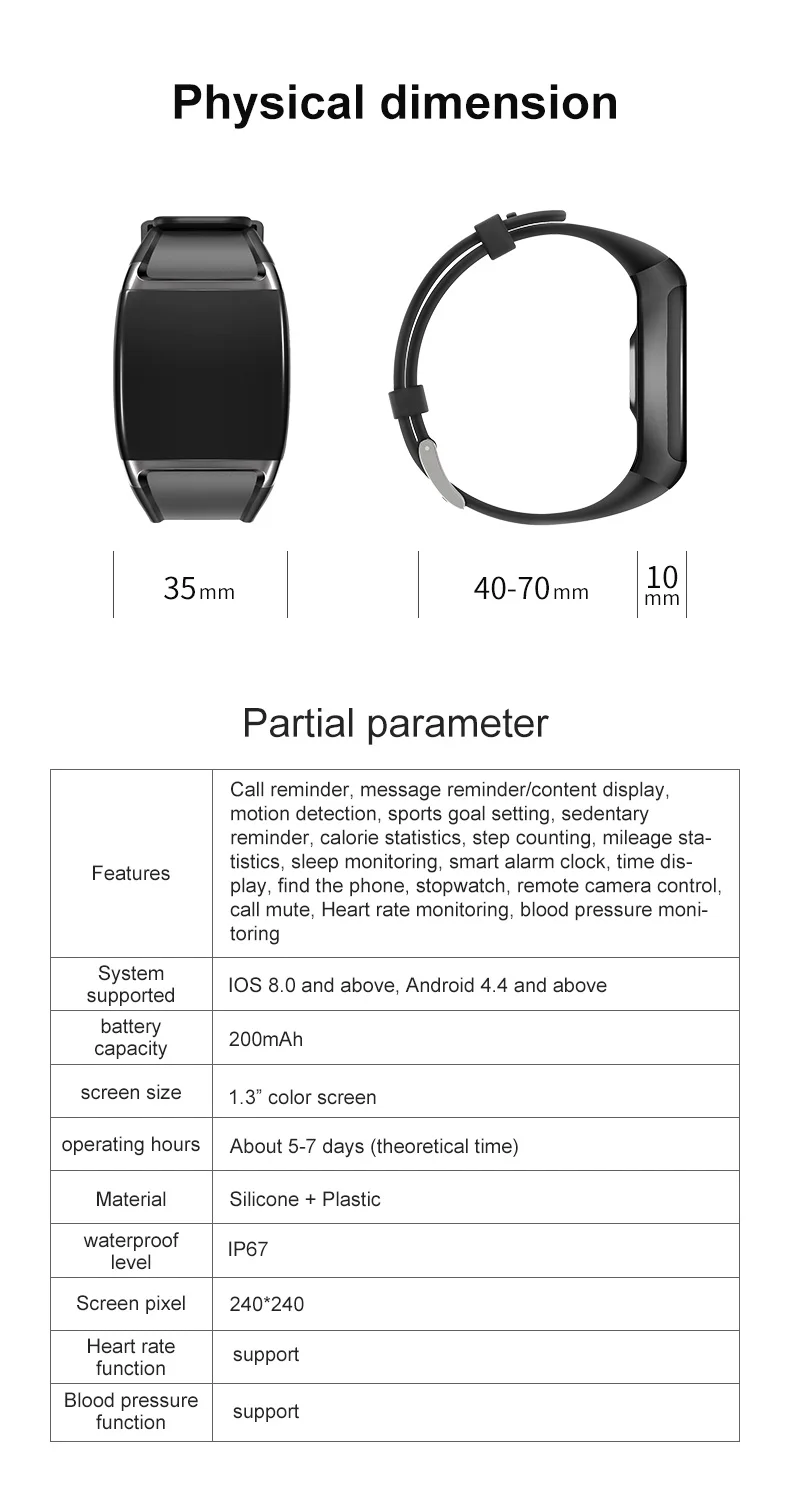 Основные функции: * 1,3 дюймов 240*240 красочные Экран * Встроенный аккумулятор 200 мАч, время работы 2-3 дня, время работы в режиме ожидания 7 дней * IP67 водонепроницаемый и пыленепроницаемый (вы можете носить его под дождем, мыть руки и принимать ванну, но не помещайте его в горячую воду) * Монитор артериального давления и пульса (отображение и анализ гистограммы, опасная сигнализация сердечного ритма) * Умные звонки и сообщения напоминание: звонки и информационный контент, SMS,WeChat,QQ,Twitter,Facebook,skype,whatsapp, twitter * Различные виды спорта, шагомер, калории, расстояние * Поддержка версии iOS 8,0 выше и версии Android 4,4 выше * Язык отображения браслета: китайский/английский * Поддерживаемые языки приложения и сообщения: китайский, китайский, традиционный, английский, японский, корейский, немецкий, русский, испанский, итальянский, французский, вьетнамский, португальский * Больше функций: время, шагомер, монитор сжигания калорий, время занятий спортом, монитор сна Примечание: 1. Носимые устройства отслеживают деятельность человека с помощью электронных датчиков, и они находятся на потребительском уровне. Это нормально для определенных отклонений. Пользователь должен рассматривать данные объективно. 2. Пожалуйста, не сравнивайте с больничным оборудованием для чтения, это не медицинское устройство! Перед использованием отсканируйте qr-код в руководстве, чтобы загрузить приложение и подключить его к часам с помощью приложения.