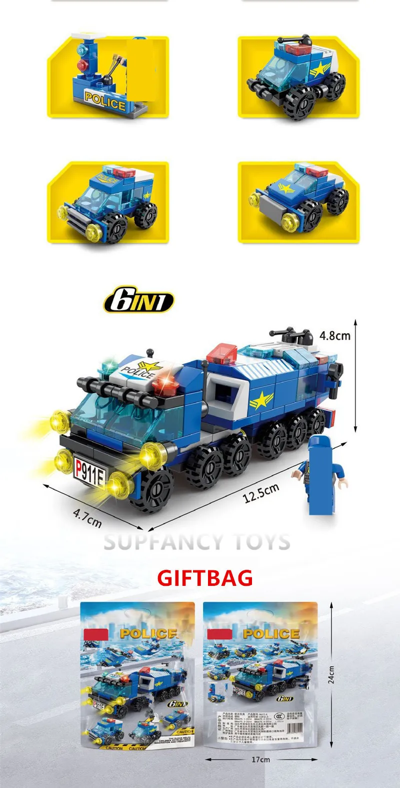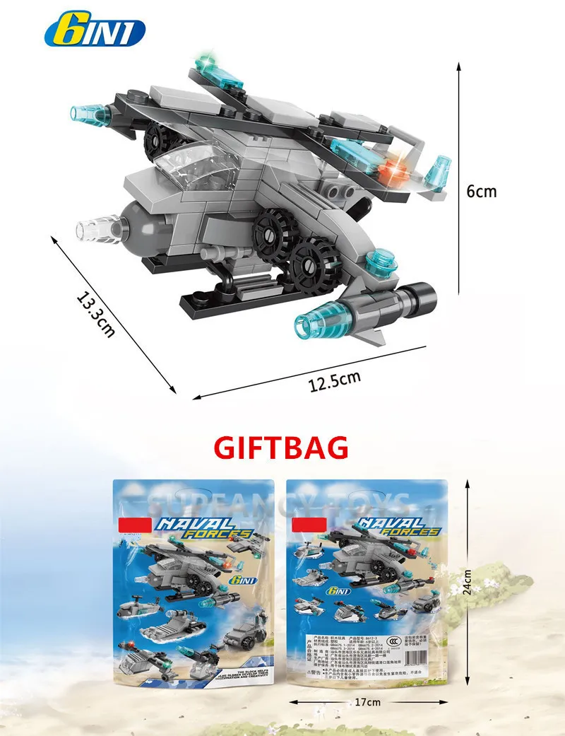 Название продукта: строительные блоки из серии «город и военные» Количество блоков: 6 в 1 136 шт ~ 159 шт Сертификат: ABS / CE, CCC, EN71 Посылка продукта: полипропиленовый пакет с пузырчатой безопасной упаковкой Упаковочный лист: блоки кирпича + руководство Примечание: товар поставляется в подарочной упаковке. Действительно хорошая посылка для детского подарка.