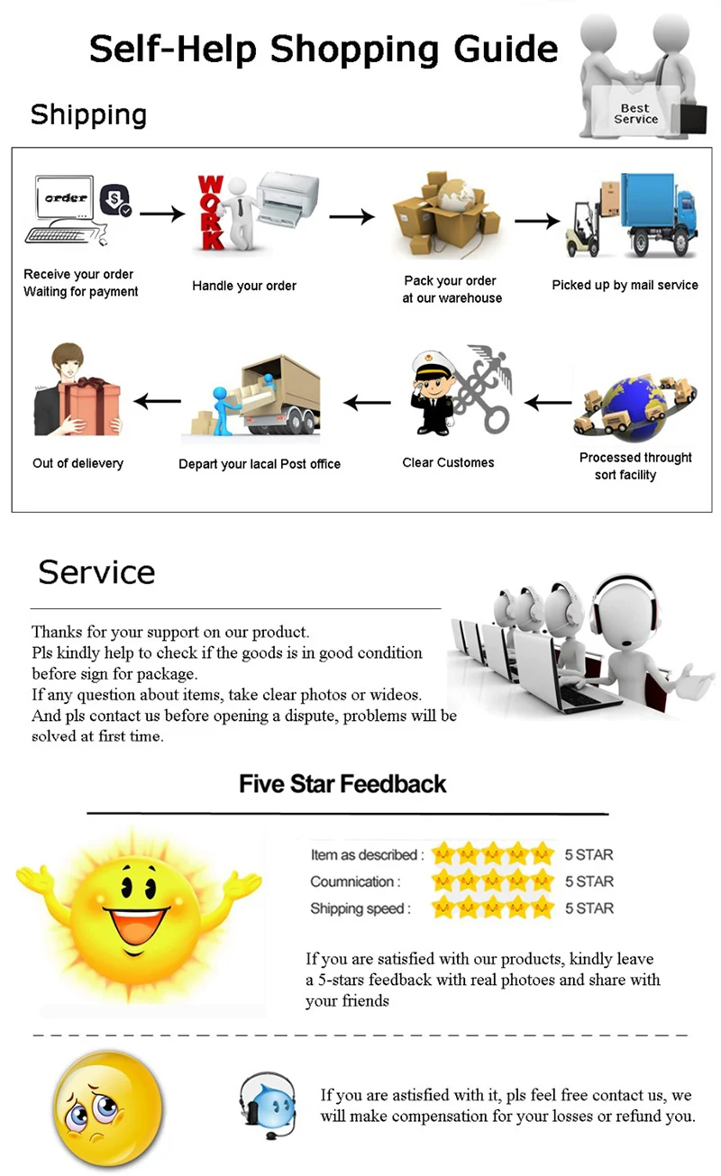Доставка и упаковка Все товары будут тщательно проверены и хорошо упакованы перед отправкой. Товары будут отправлены в течение 1-5 рабочих дней после оплаты покупателем заказа. Обычно доставка посылка в пункт назначения занимает от 15 до 60 рабочих дней (для отдаленных районов доставка может занять немного больше времени). Между тем, вы можете выбрать EMS или DHL экспресс-доставку, чтобы сократить время доставки, если вам нужен заказ срочно (пожалуйста, подтвердите свое имя получателя и информацию о доставке перед размещением заказа). Sperclal объявление: Аргентина: Обычно это занимает от 60 до 90 дней для dellvering заказа на ваше место. Бразилия: требуется CPF или CNPJ. Обычно это занимает от 60 до 90 рабочих дней для dellvering заказа на ваше место. Российская Федерация: Необходимо полное имя получателя. Обычно Доставка заказа на ваше место занимает от 15 до 65 рабочих дней. Если вы не оформляете заказ в течение 60 дней, пожалуйста, свяжитесь с нами, прежде чем оставить отрицательный и нейтральный отзывы, мы сделаем все возможное, чтобы помочь вам решить проблему. Возврат 1. Если товар не в хорошем состоянии, пожалуйста, свяжитесь с нами перед возвратом товара. Мы отправим другой новый товар как замена, как только возвратим возвращенную посылка. 2. Пожалуйста, верните неисправный товар заказной авиапочтой в течение 5 календарных дней после получения заказа. 3. Пожалуйста, сделайте возврат посылка как можно меньше, и, пожалуйста, сделайте возврат груза ниже, чем 5,00 долларов США.