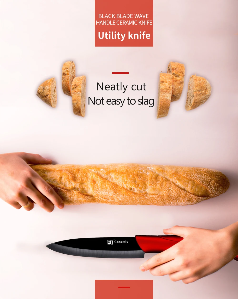Предназначено для резки фруктов, овощей и бескостного мяса, не предназначено для подделки, сгибания, насильственного измельчения или склеивания. Использоваться на пластиковой или деревянной разделочной доске и избегать резки замороженных продуктов или на поверхности мрамора, стекла и стальной доски. Мойте нож после каждого использования, желательно вручную с мягким моющим средством и не мойте его в посудомоечной машине. Для безопасности наконечник и пятка лезвия были повреждены.