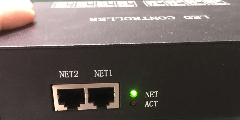 Подключите NET1 к компьютерному сетевому интерфейсу с кабелем RJ45 (кроссовер). Зеленый светильник мигает.