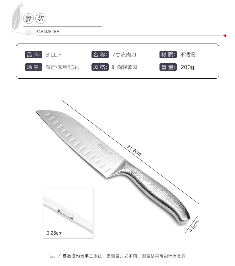 Бренд: BIL L.F Название: 7-дюймовый машина для нарезания замороженного мяса кухонный нож Материал: нержавеющая сталь Место: Ресторан/дом/доставка Стиль: модный светильник в роскошном стиле Вес: 200 г 0,25 см Толстая прочная Примечание: данные о продукте-все ручные испытания. Из-за различных методов тестирования результаты измерений могут отличаться
