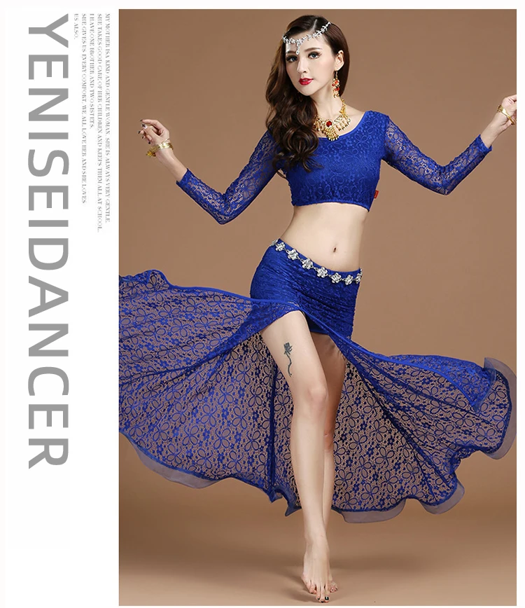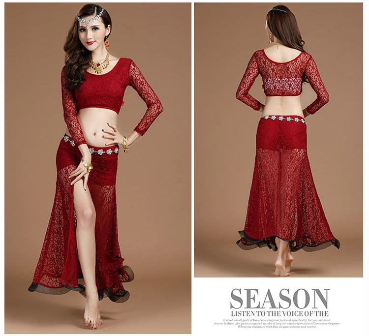 3 цвета, новинка, высокое качество, кружевная одежда с длинным рукавом для танца живота, сексуальное платье для танцев, длинная юбка с разрезом, красные, черные топы, Короткие