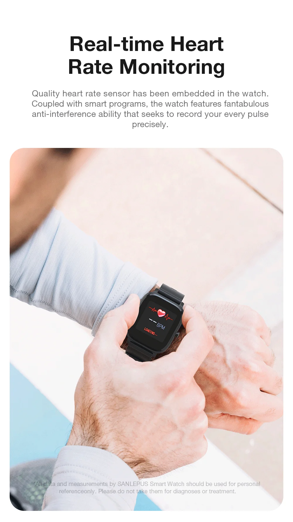 Качественный датчик сердечного ритма встроен в часы. В сочетании с умными прогами часы обладают фантазийной функцией защиты от помех, которая позволяет точно записывать каждый ваш пульс. * Все данные и измерения SANLEPUS Smart Watch должны использоваться только для личной справки. Пожалуйста, не принимайте их для диагностики или лечения.