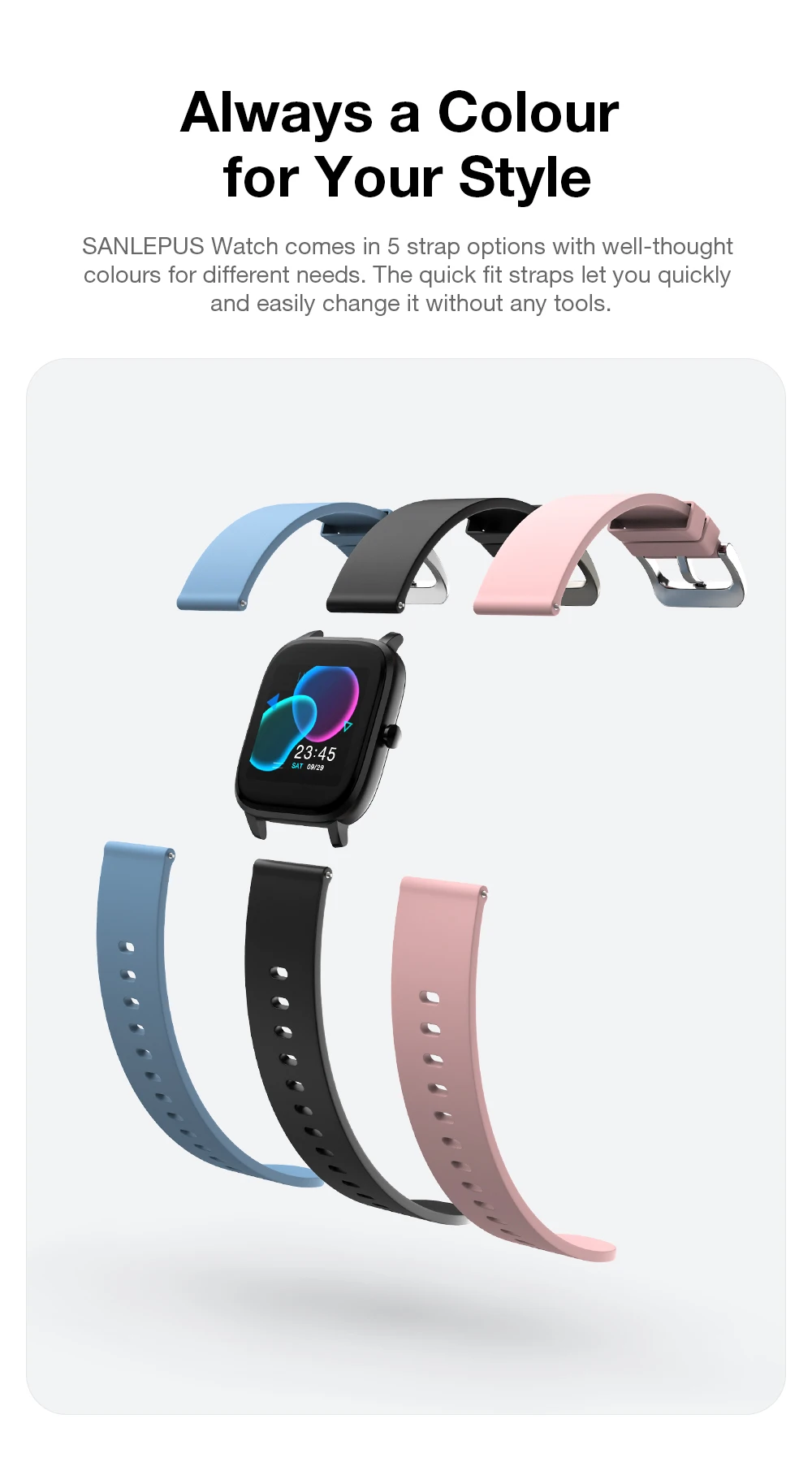 Часы SANLEPUS поставляются в 5 вариантах ремешков с продуманными цветами для различных потребностей. Ремни quick fit позволяют быстро и легко менять их без каких-либо инструментов.