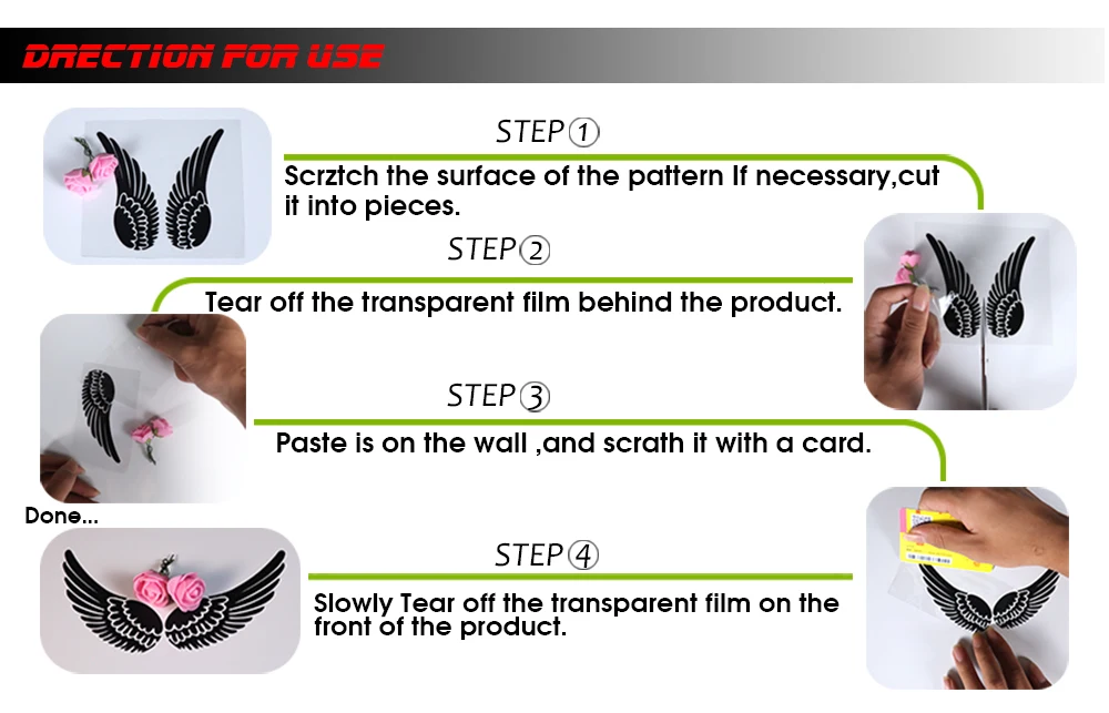 2.Наши наклейки не напечатаны, поэтому они не содержат фона, стены или поверхности, которые вы применяете, будут фоном.