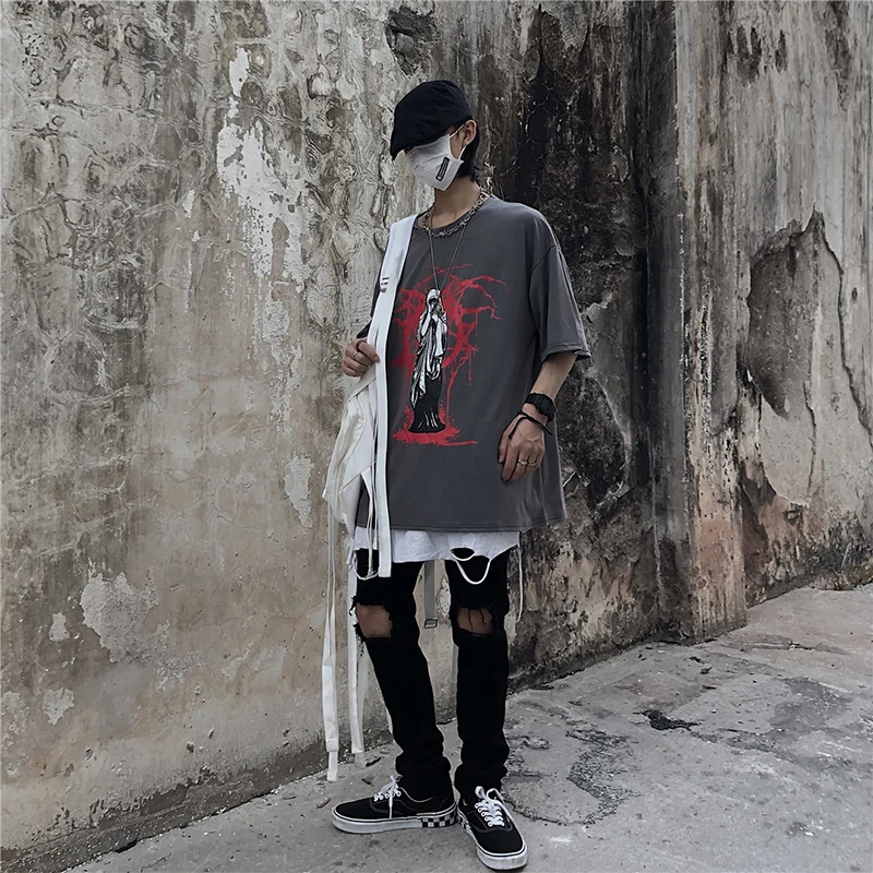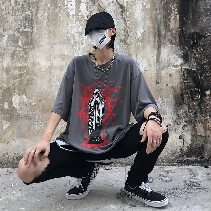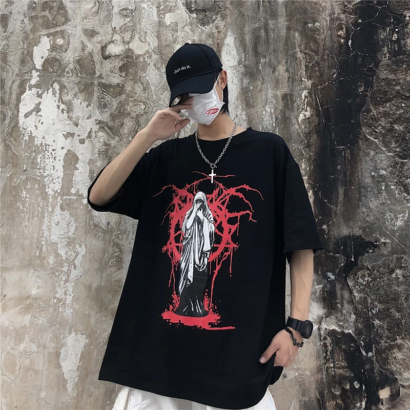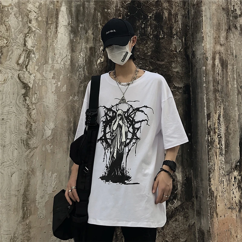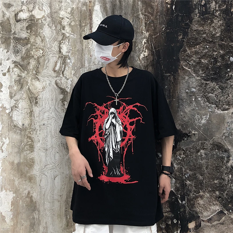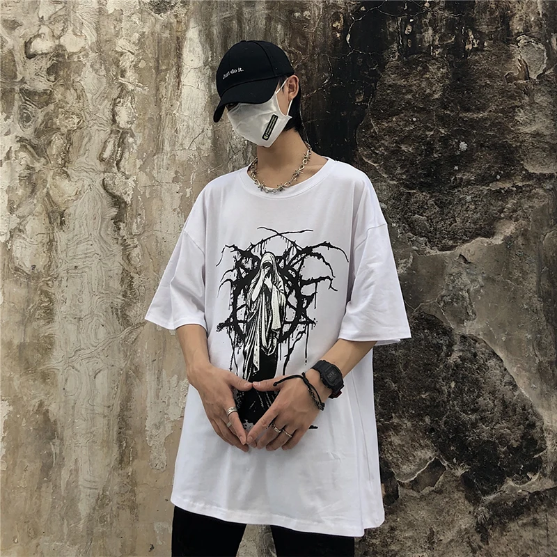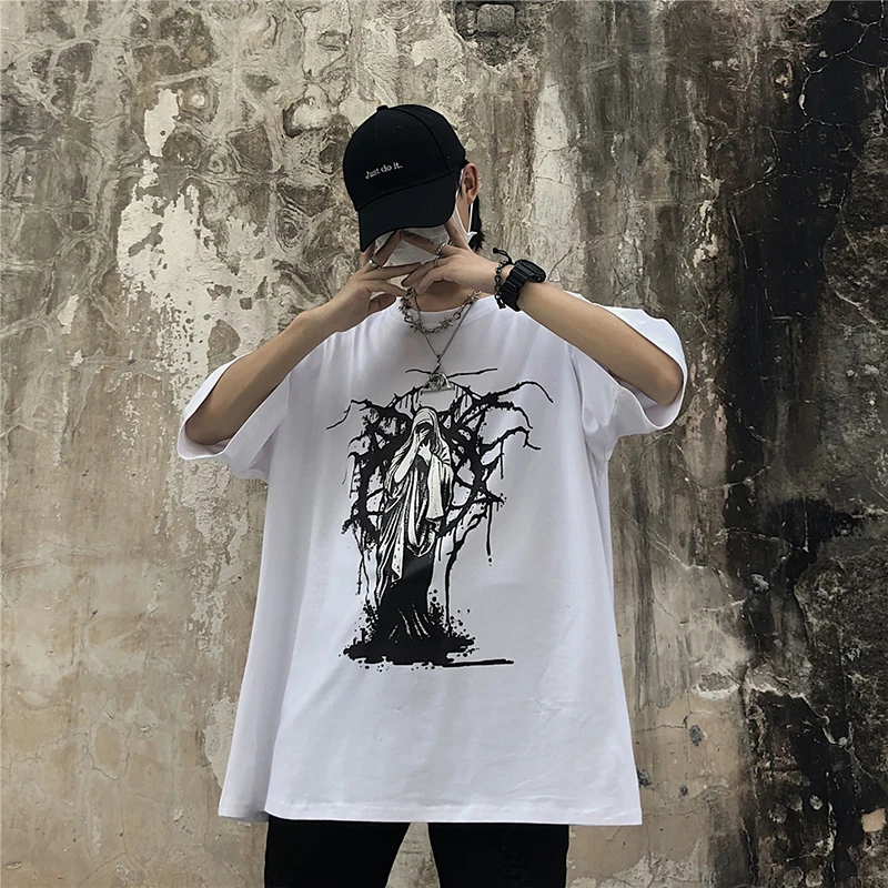 Cool Cartoon Print Woman Rock T-shirts 2020 Summer Unisex Short Sleeve Loose Punk O Neck Basic T-Shirt Top Black White Dark Gray