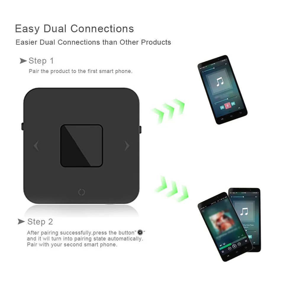 Режим передатчика беспроводная передача аудио от не-BT (плеер, такой как TV / mp3/настольный) Домашняя стереосистема к BT динамику или гарнитуре. Режим приемника Беспроводная передача аудио с телефона или планшета с поддержкой BT на проводные стерео, колонки или наушники.