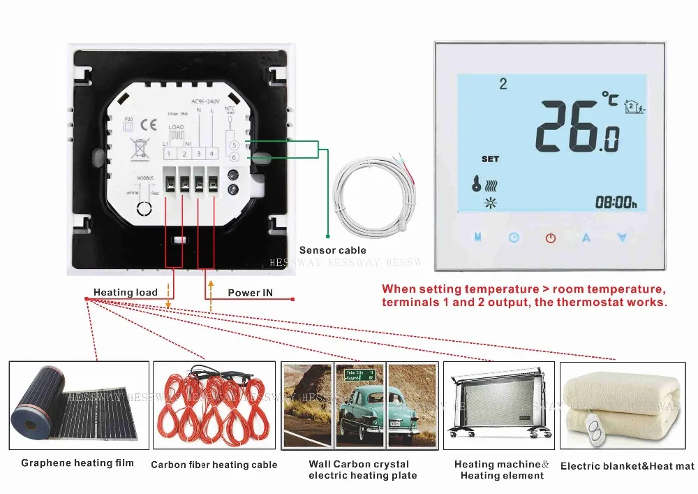 Современный термостат с сенсорным экраном 1000GBLW, Wi-Fi, был разработан для включения/выключения нагревательного кабеля, электрической нагревательной пленки, нагревательного элемента, нагревательного аппарата по сравнению с комнатной температурой и температурой. В качестве достижения цели комфорта и экономии энергии, ваш мобильный телефон. Независимо от того, остаетесь ли вы дома или за рубежом, вы можете управлять температурой своей комнаты. Легко. Технические данные: