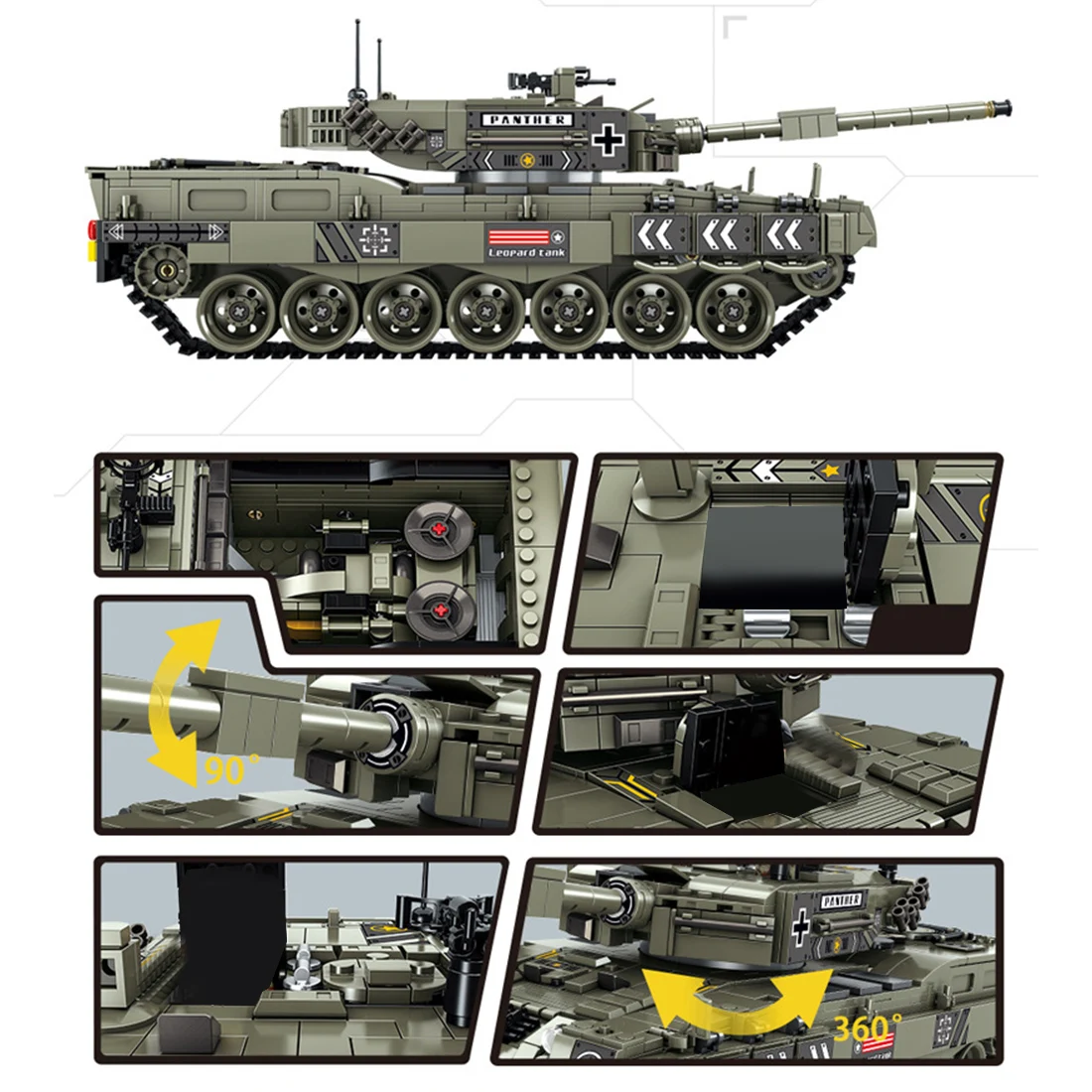 . Стиль необычный и уникальный. Он основан на немецком танке Пантеры. Переработанный бак не только Реалистичный, но и очень восстановительный. Он оснащен кабиной для вождения и кабиной. Форт может вращаться на 360 градусов, может быть совместим с фигурами строительных блоков