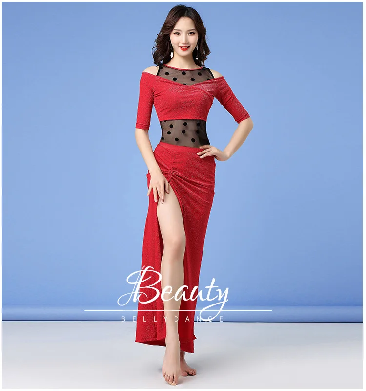 Женский костюм для танца живота, 2 шт./компл., короткий топ в горошек с рукавом до локтя, длинная юбка для взрослых, сексуальное платье с шарфом