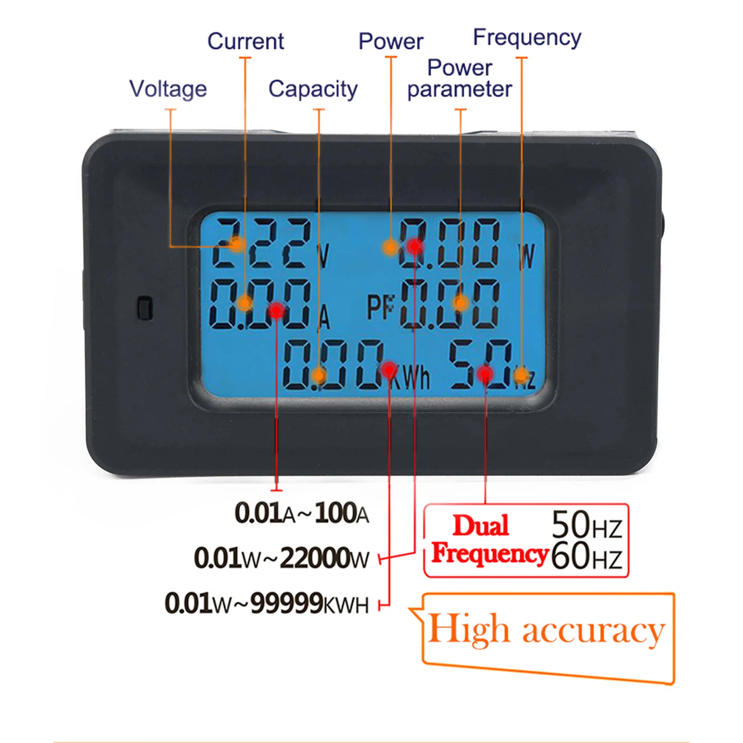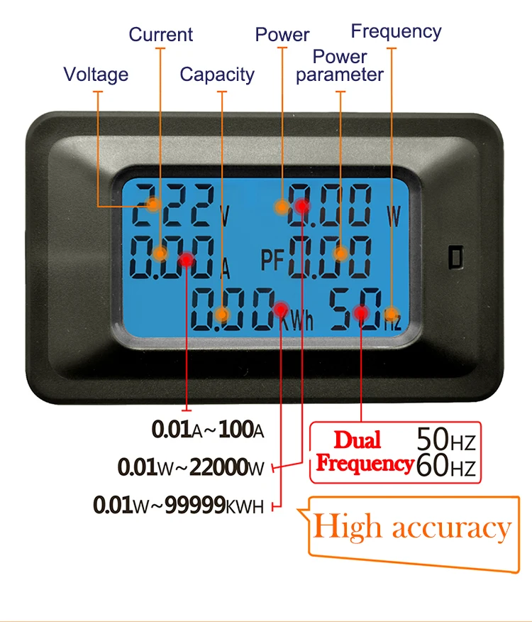 * Полноэкранный дисплей мощность, ток, напряжение, частота, коэффициент мощности, потребление энергии одновременно