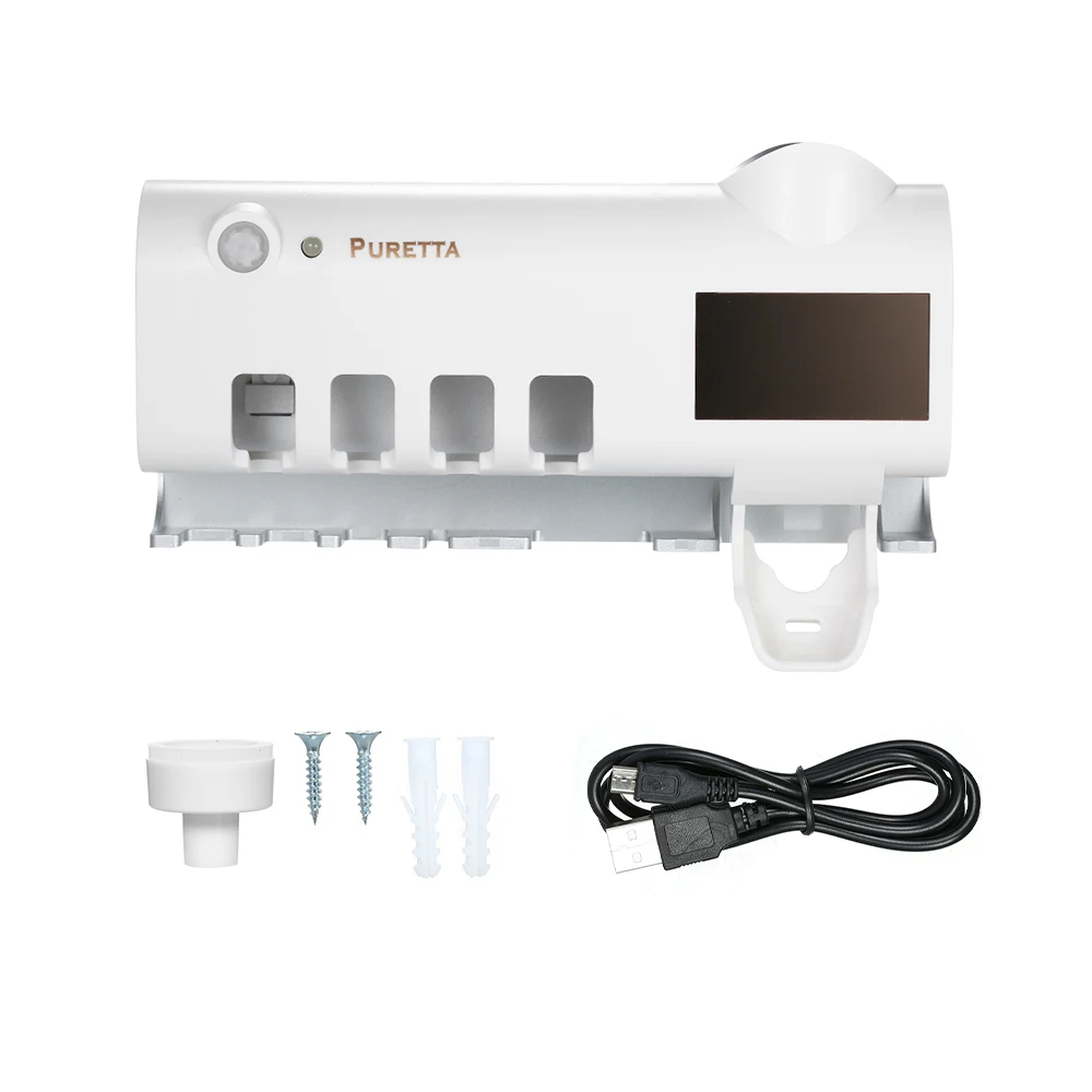 4 отделения для хранения зубной щетки в передней и задней строках имеют 5 отделений для хранения зубной нити, скребок для языка, Бритв И т. д., что помогает иметь меньше беспорядка на прилавке.