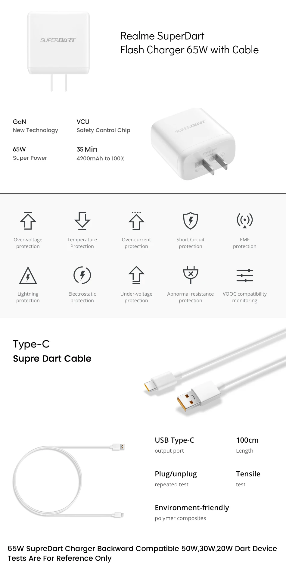 Модель: VCA7GACH(USB A To Type C) Вход: 100-240 В/1,6 A Выход: 5 В/2 А или 10 В-6,5a макс Режим: VCA7JCCH (тип C-тип C) Вход: 100-240 В/1,8 A Выход: 5 В/3 А или 10 В/6,5a макс PDO:5 В/3 А, 9 В/3 А или 12 В/3 А, 15 В/3 А PPS:5-11V/5A или 5-16V/2.8A Совместимость со всеми смартфонами Realme и OPPO 65 Вт 50 Вт 30 Вт 20 Вт обратная совместимость (Максимальная выходная мощность зависит от вашего телефона) Совместимость со смартфонами OnePlus 30W MAX